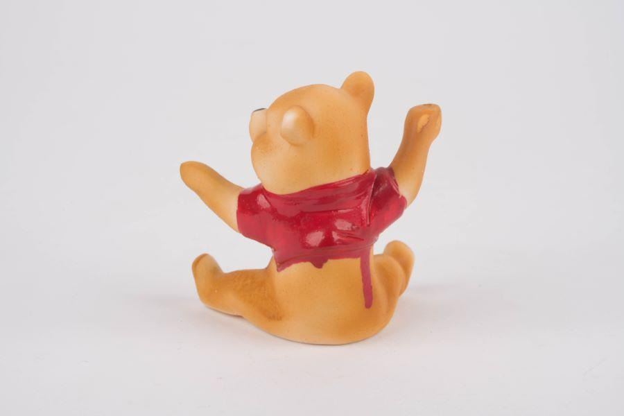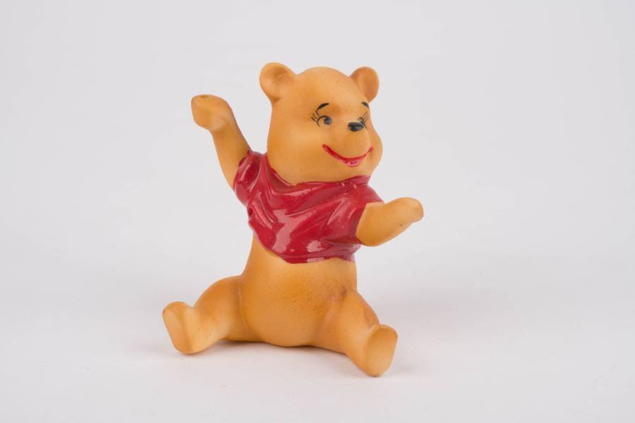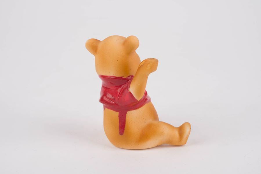 (Enesco, 1964) A ceramic figurine of Disney’s Winnie the Pooh. Disney started to license Pooh merchandise in 1964, two years before the first animated featurette was released. Measuring 3.25" tall, the figurine is in good condition with manufacturing inconsistencies in the paint, some dripping and bubbling, surface wear, and missing the original balloon accessory.