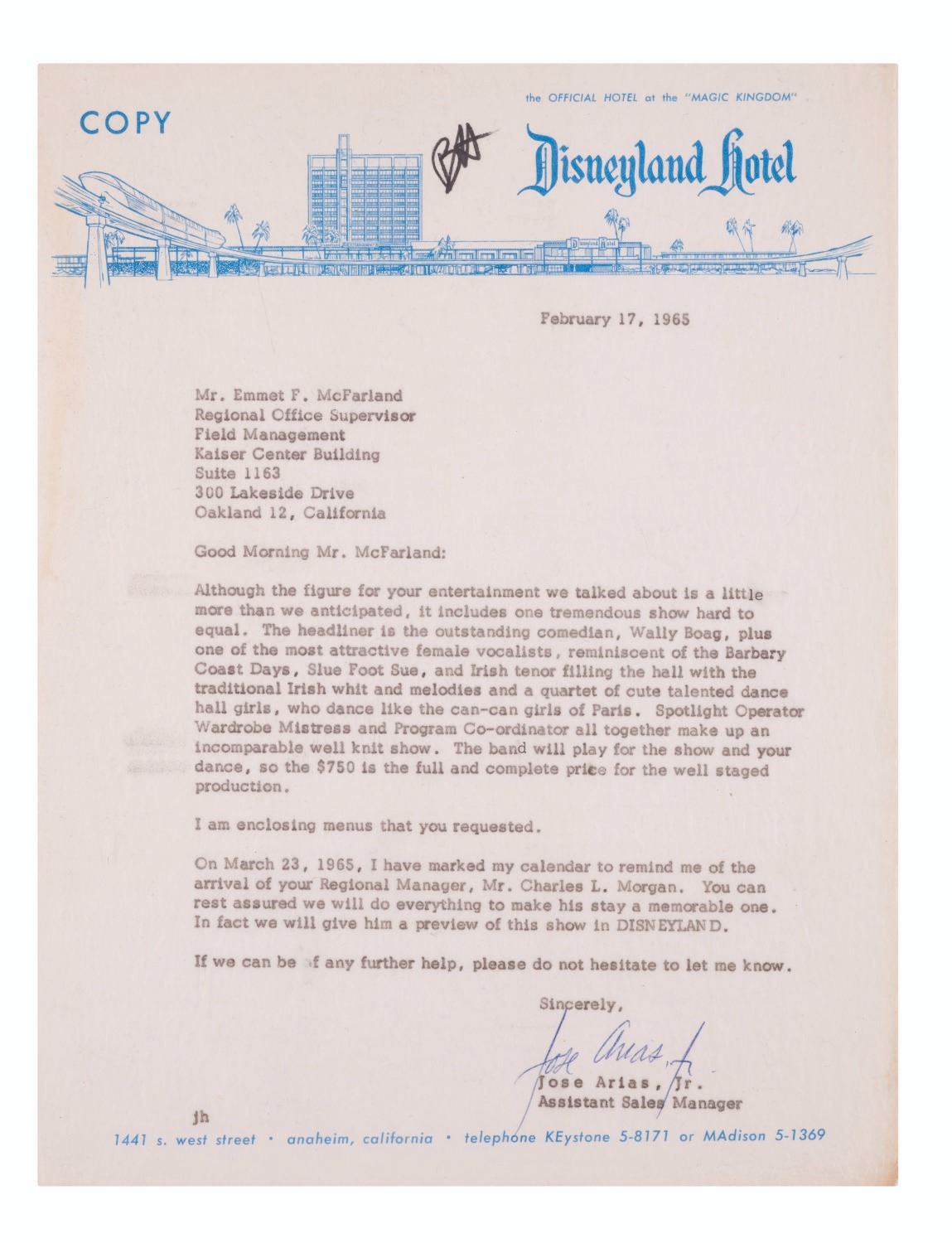 (Disneyland, 1965) The file copy of a letter on Disneyland Hotel stationery. Dated February 17, 1965, the letter concerns the cost of a private performance of the Golden Horseshoe Revue naming Wally Boag and Slue Foot Sue as performers. The letter is in very good condition with light discoloration from age.