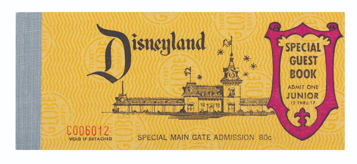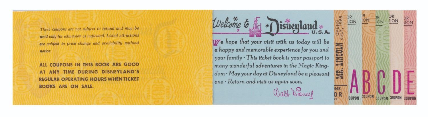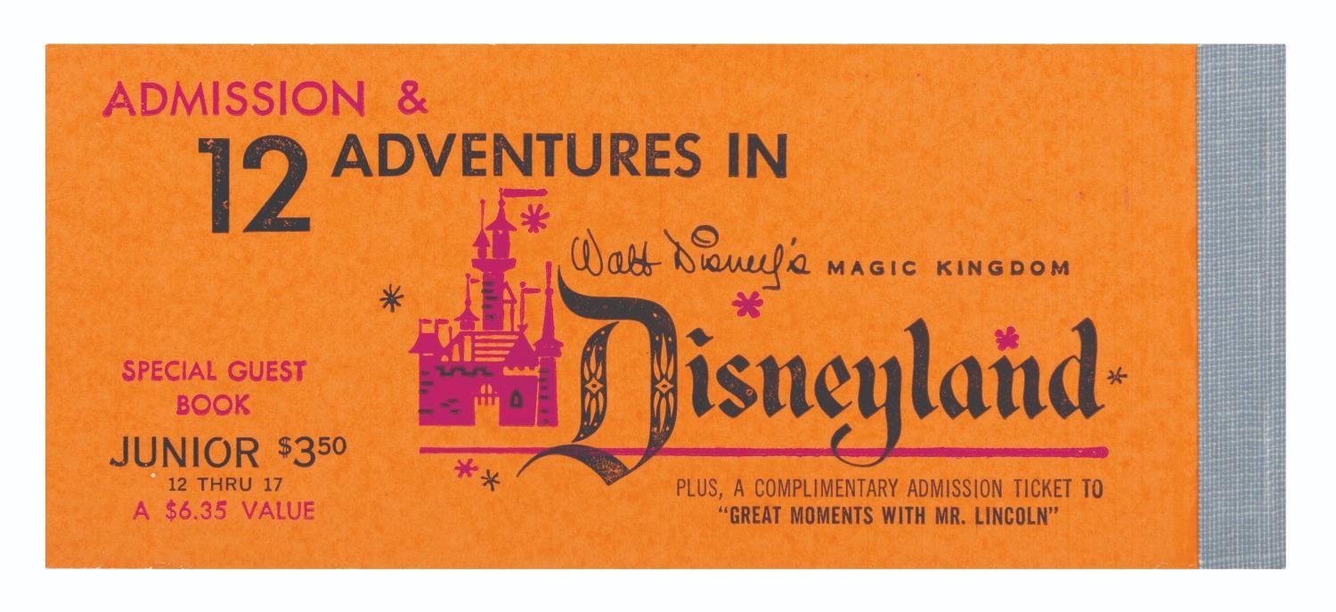 (Disneyland, 1965) A complete Junior Admission and 12 Adventures in Disneyland Special Guest ticket book from June of 1965. The book includes the front Main Gate admission ticket, Welcome to Disneyland tab, a Great Moments With Mr. Lincoln ticket, 1 “A” ticket, 1 “B” ticket, 3 “C” tickets, 3 “D” tickets, and 4 “E” tickets. Numbered “C006012,” the 2.5” x 6” ticket book is in fine condition.