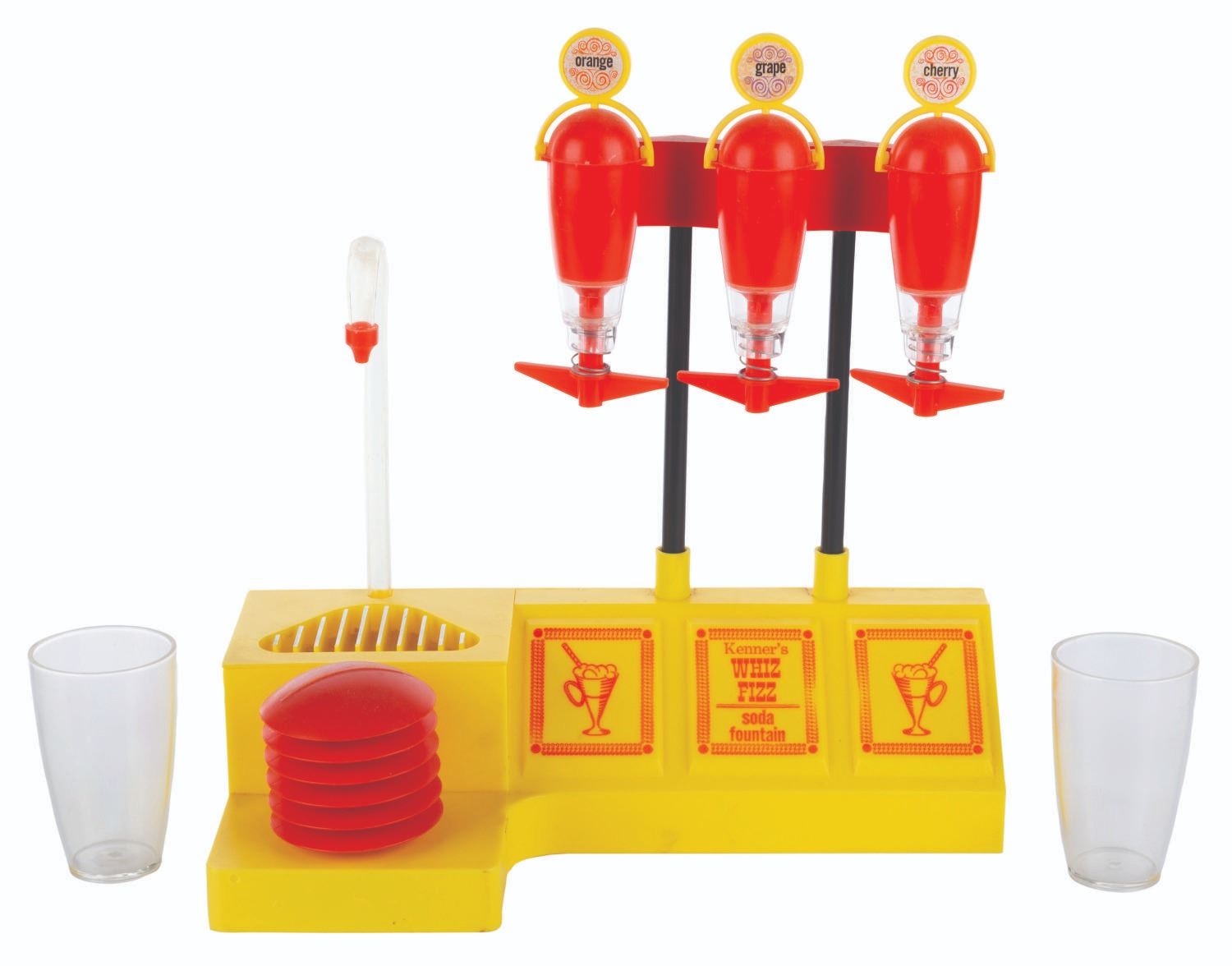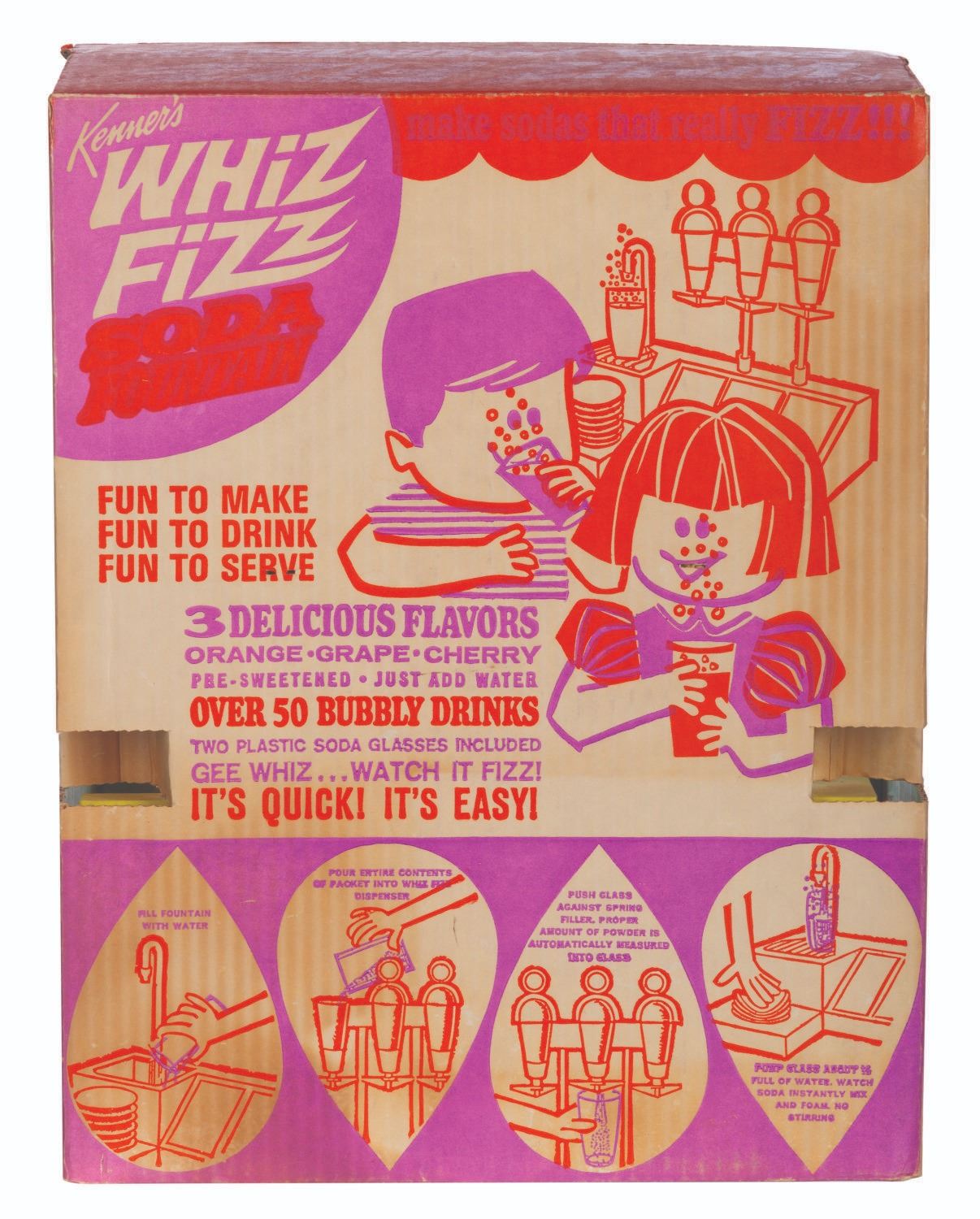 (Kenner, 1965) A complete Whiz Fizz Soda Fountain toy by Kenner. This original version in a cellophane windowed box comes with the soda fountain toy; orange, cherry, and grape flavor packets; two cups, and instructions. In the box measuring 12.5”x 7” x 16” high, the toy is in very good unused condition, with the box in good condition with typical wear from age and handling including scuffs, wear to tabs, and some discoloration. The flavor packets are sold for collecting purposes only, not for consumption.