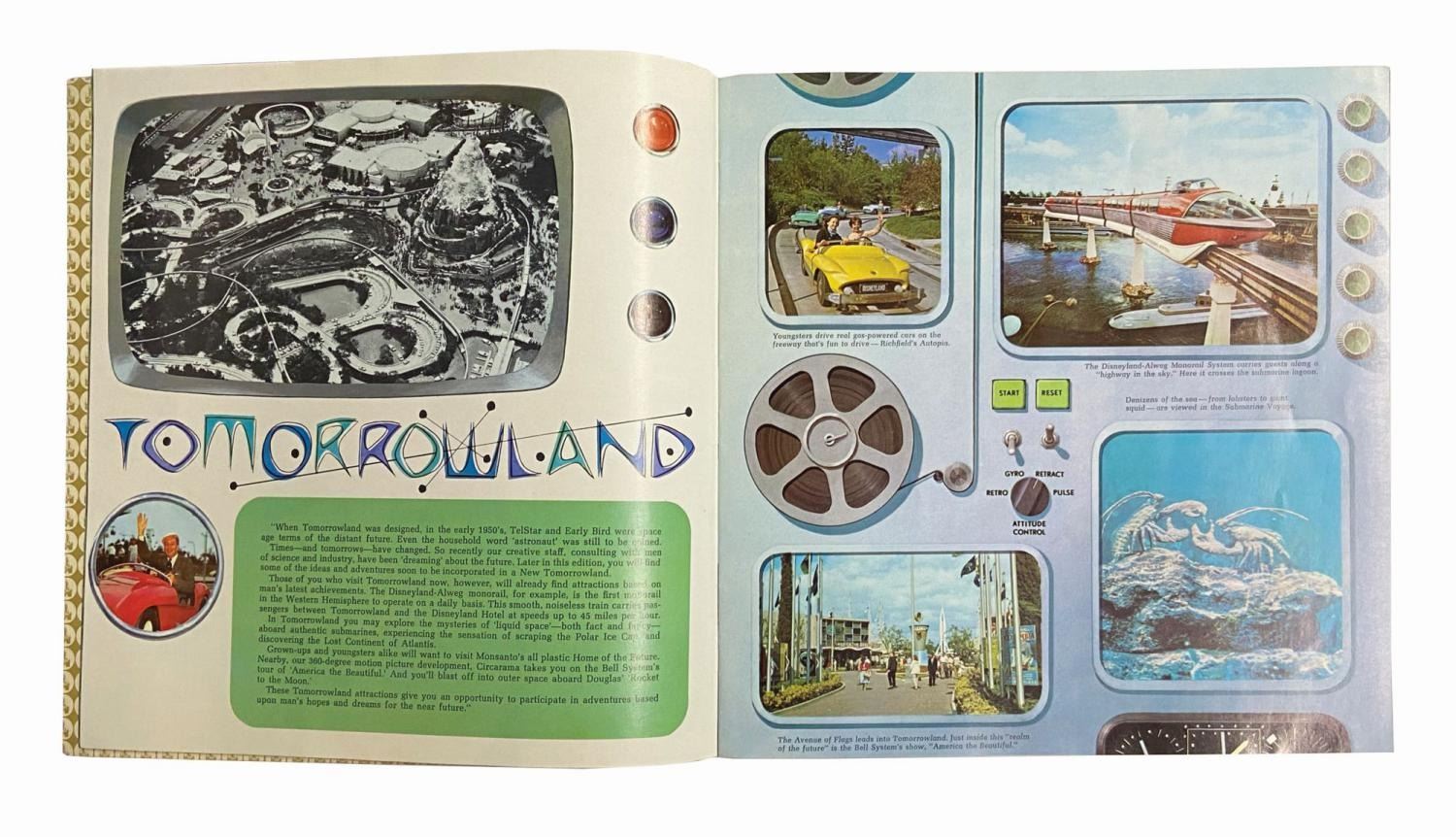 (Disneyland, 1965) A pictorial souvenir book of Disneyland from 1965, providing Guests with photos, artwork, and information on their favorite lands and attractions, and promoting the soon-to-open New Orleans Square. The 32-page book measures 10.5" x 10.5" and is in good condition with creases at the spine and handling wear.