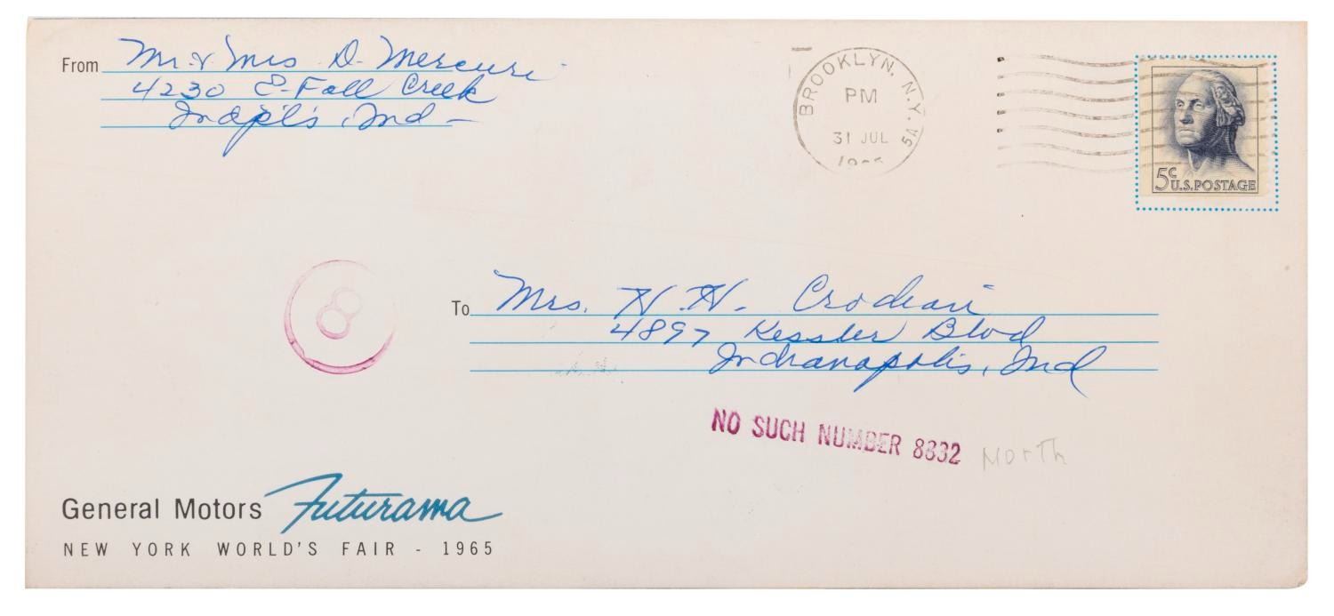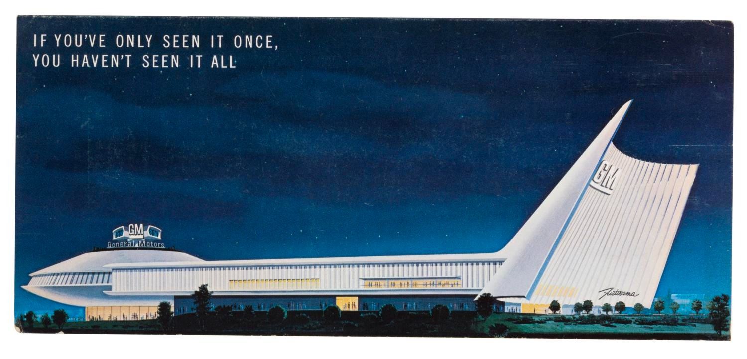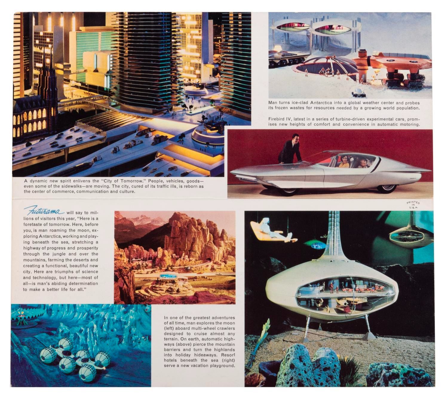 (GM, 1965) A mailer pamphlet for the General Motors Futurama pavilion at the 1964-65 World’s Fair, highlighting details of their exhibits of mankind’s technological potential for prosperity. Measuring 8" x 9", the pamphlet is in very good condition, with a stamp and writing on the outside from having been mailed.