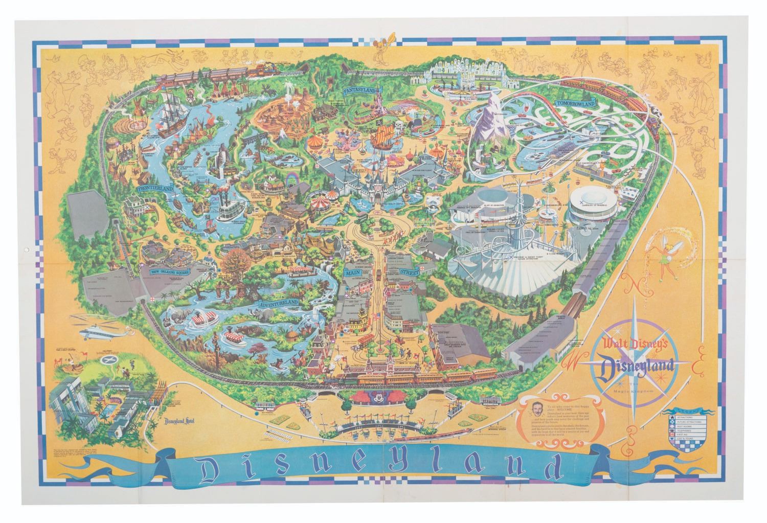 (Disneyland, 1966) A large souvenir map of Disneyland from 1966. This map was the first to feature the New Tomorrowland and World's Fair attractions It's a Small World and Great Moments With Lincoln. Measuring 45"x30", this map is in very good condition exhibiting a few faint spots of discoloration, small tears at the junctions of the original folds, and light wear along its edges.