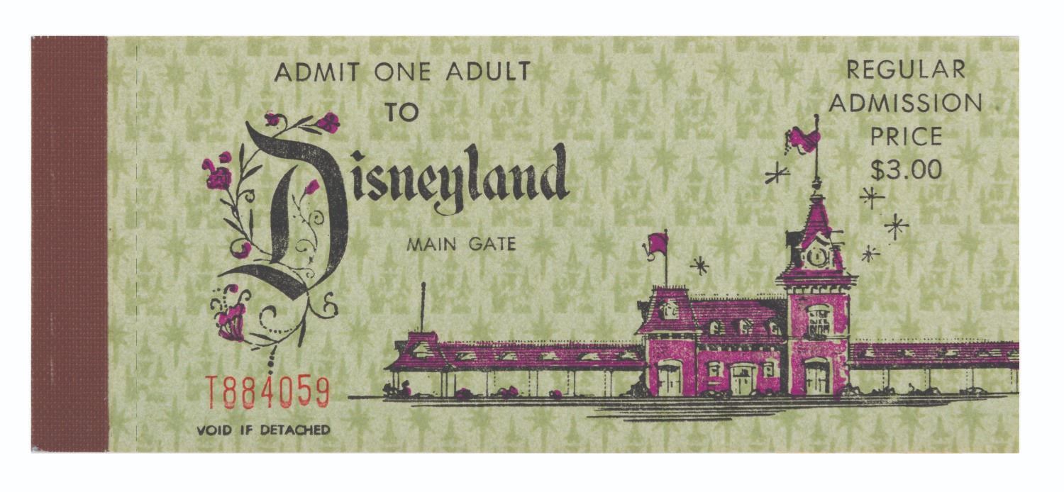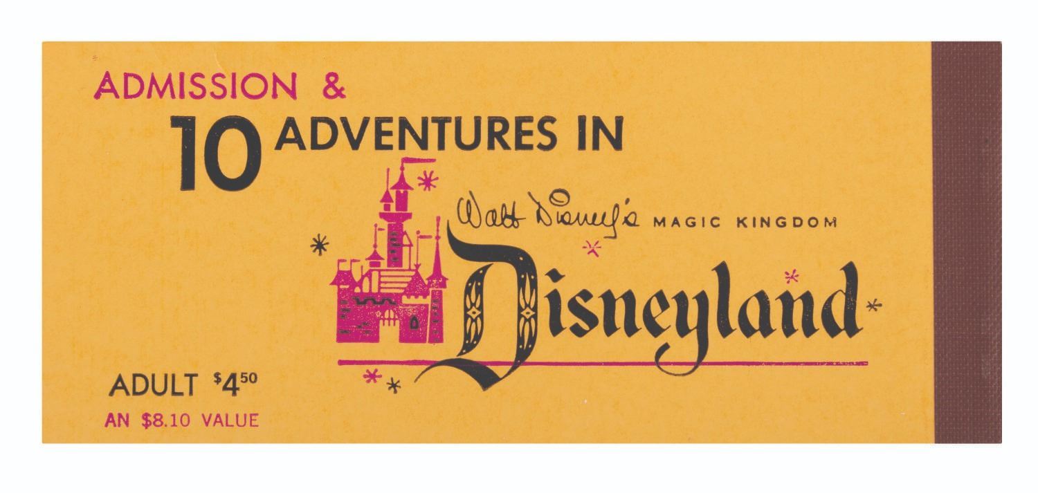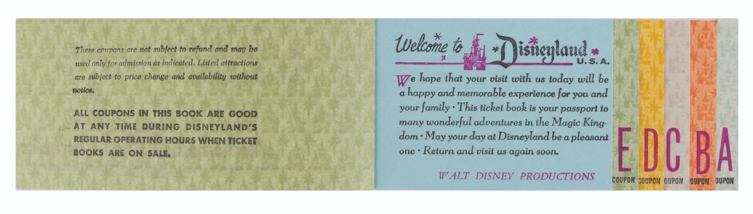 (Disneyland, 1967) A complete Adult 10 ticket book from May of 1967. This book includes the front Main Gate ticket, a Welcome to Disneyland tab, 3 “E” tickets, 3 “D” tickets, 2 “C” tickets, 1 “B” ticket, and 1 “A” ticket. Numbered “T884059”, the 2.5” x 6” ticket book is in fine condition.