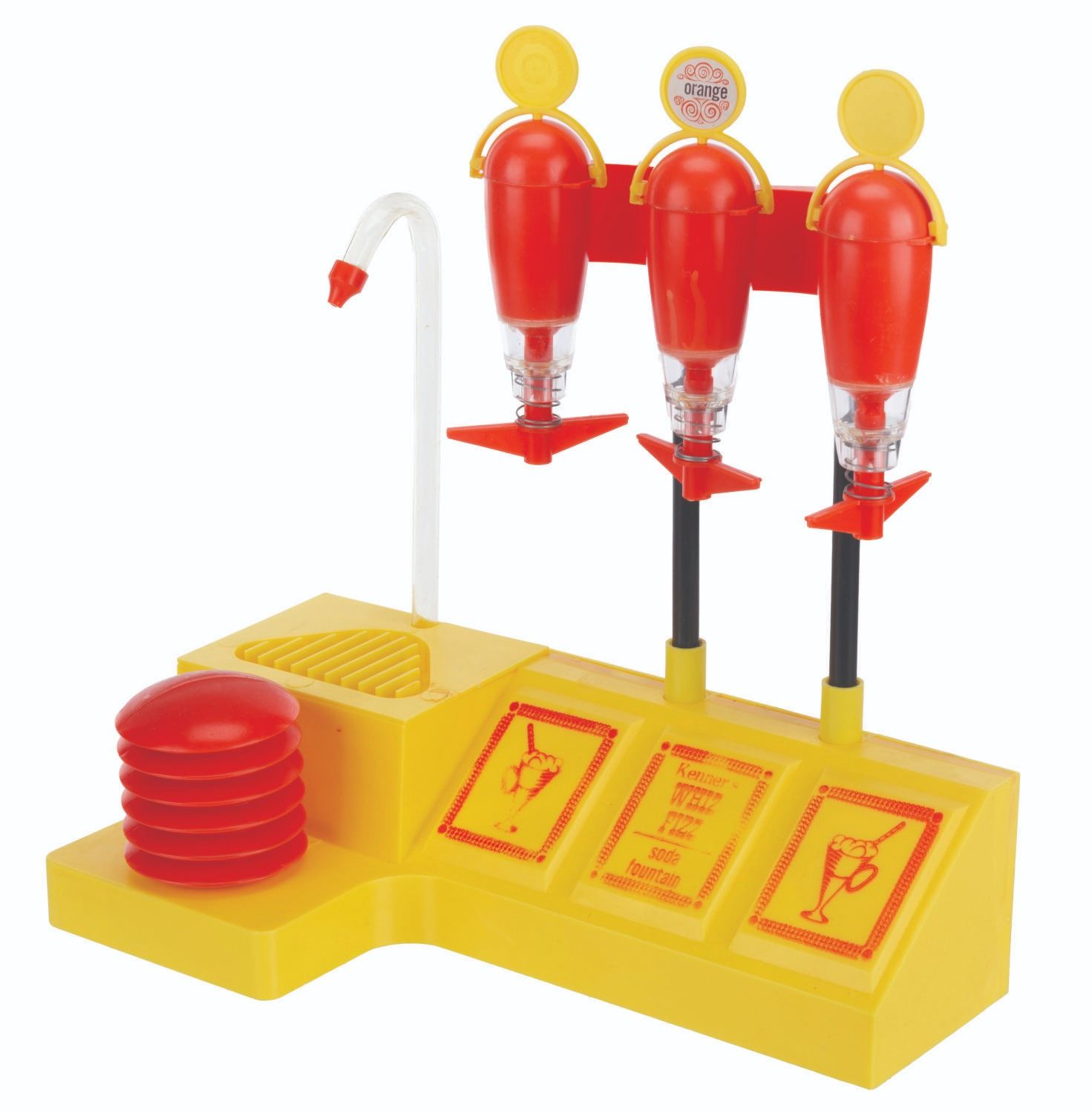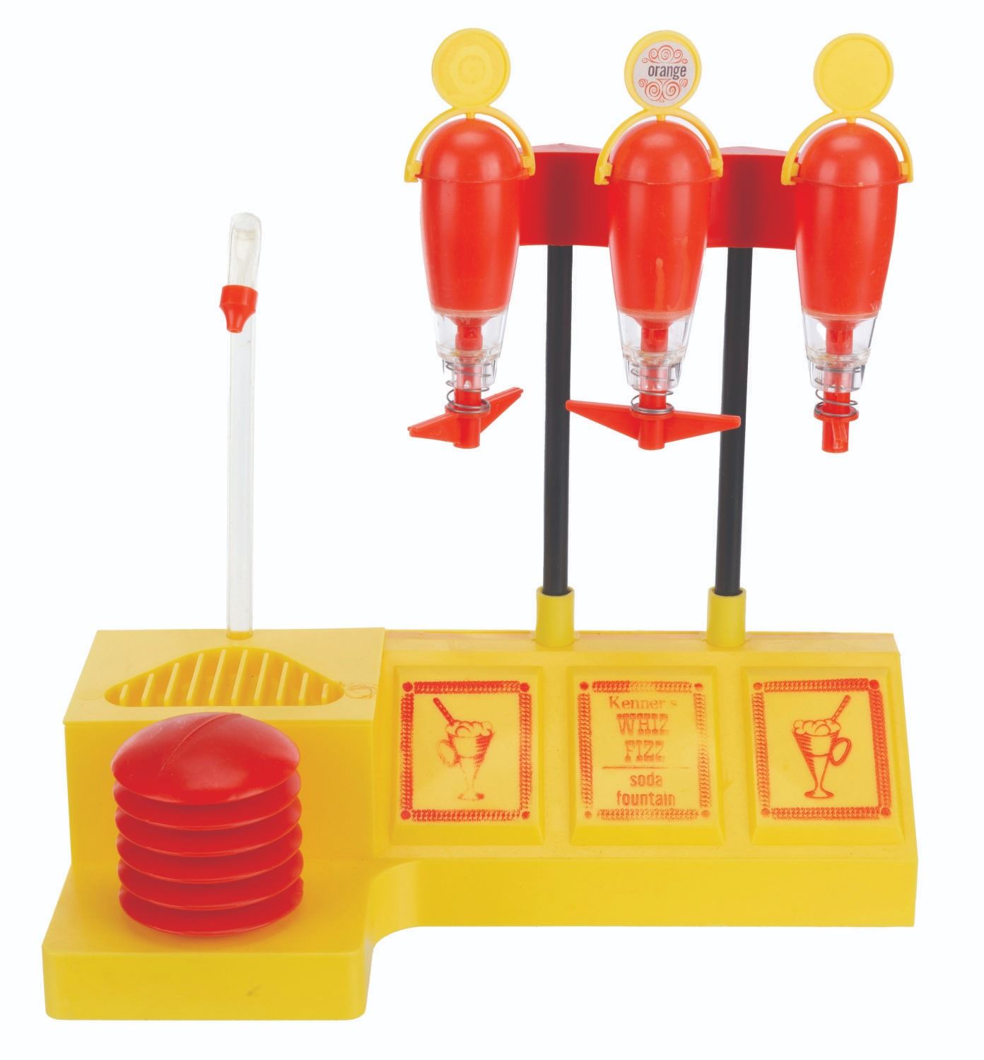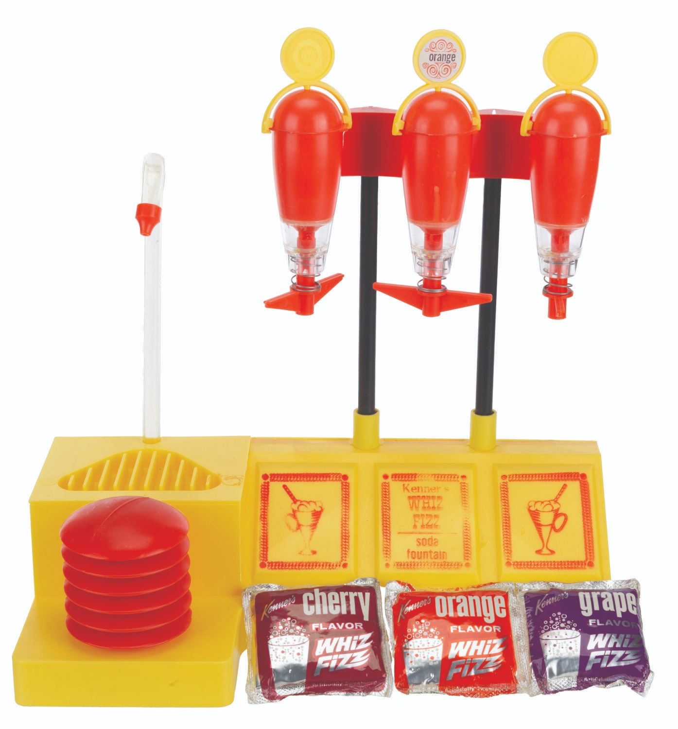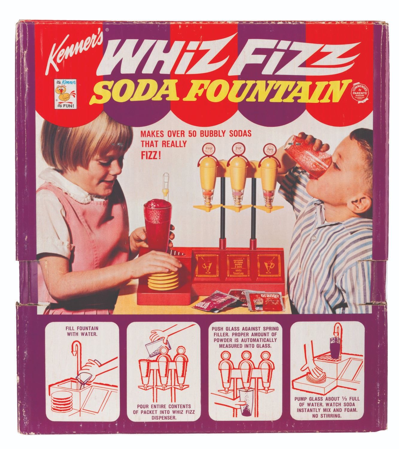 (Kenner, 1967) A complete Whiz Fizz Soda Fountain toy by Kenner. This second version in a box with photographs comes with the soda fountain toy; orange, cherry, and grape flavor packets; two cups, and instructions. In the box measuring 12.5”x 7” x 14” high, the toy is in very good used condition, with some wear to lettering on the soda fountain. The box is in good condition with typical wear from age and handling including scuffs and wear to edges and tabs. The flavor packets are sold for collecting purposes only, not for consumption.
