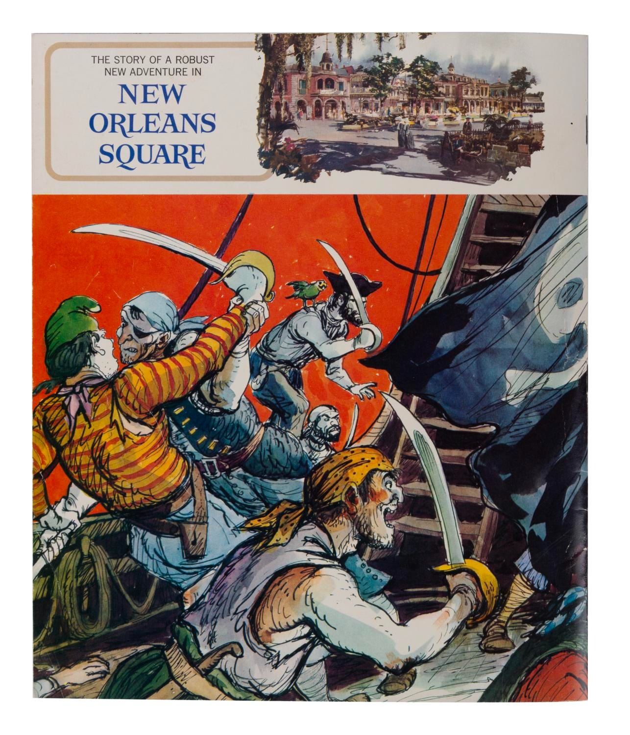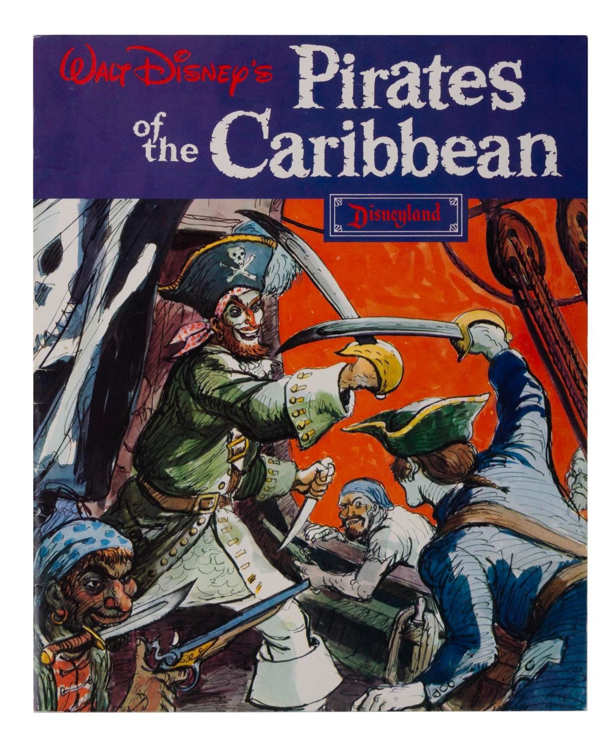 (Disneyland, 1968) A souvenir guidebook for Disneyland's Pirates of the Caribbean attraction. This book contains legends of historical pirates as well as Imagineering concept art by Marc Davis, photos of the realized attraction, and much more. This guidebook measures 10.75"x9" and is in very good condition, with some wear and creases parallel to the fold of the cover.