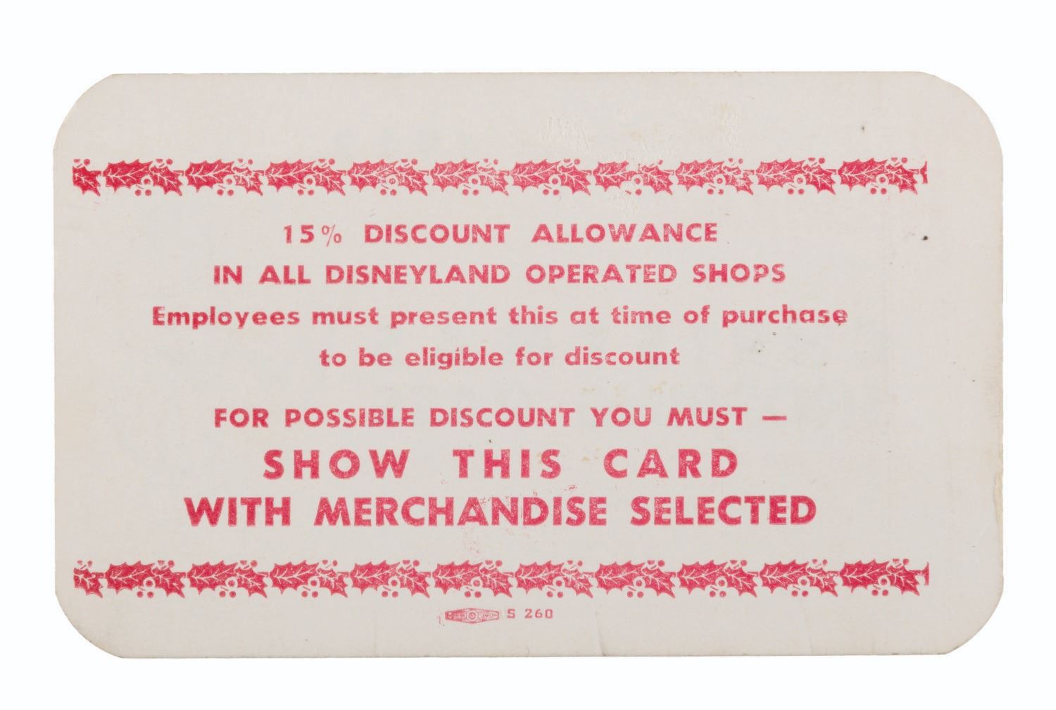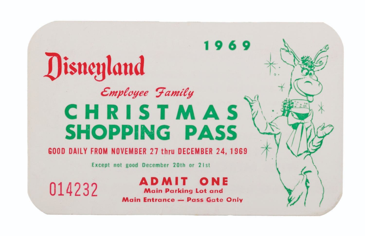 (Disneyland, 1969) A Disneyland Employee Christmas Shopping Pass. These admission cards granted relatives of Cast Members entry to the Park with discounts from some merchants at Disneyland and the Disneyland Hotel from November 27 thru December 24, 1969. Measuring 2.5" x 4", the pass numbered 014232 is in good condition with creases, scratches, scrapes on the reverse, and wear.