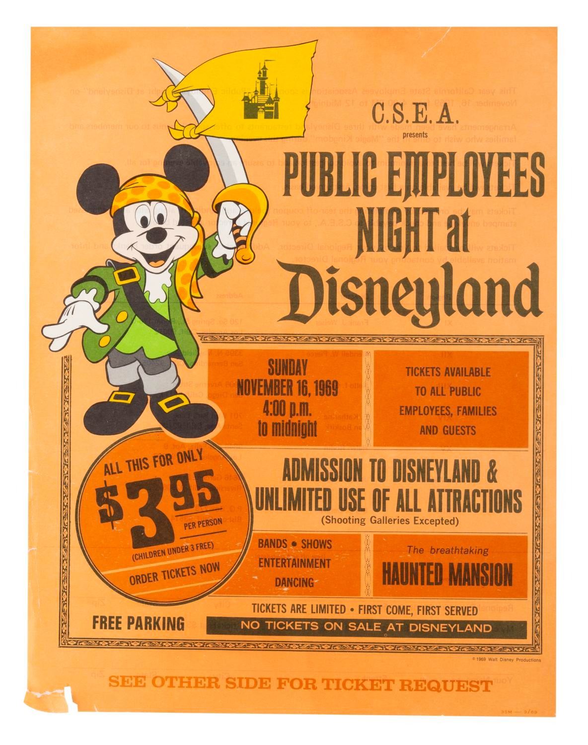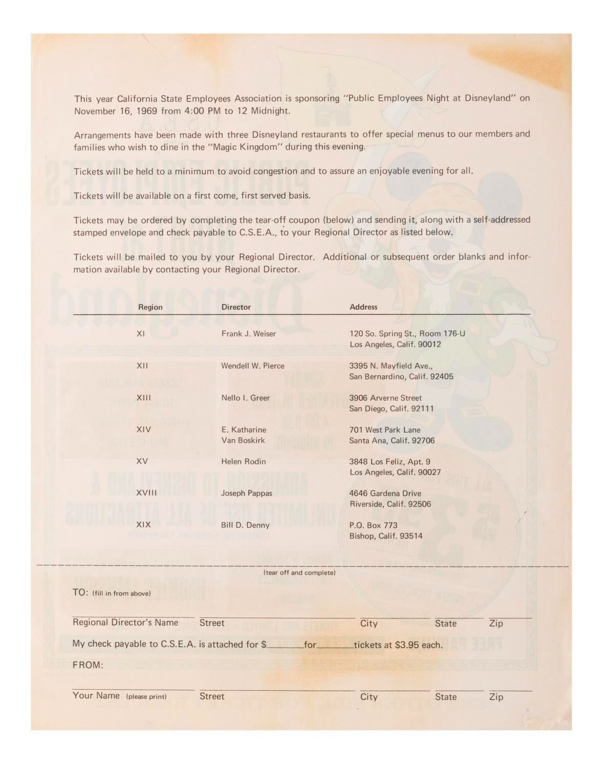 (Disneyland, 1969) A flyer for the California State Employee Association’s private party night at Disneyland. The flyer promises access to all attractions in the Park for under 4 dollars, including the latest attraction, "The breathtaking Haunted Mansion." Measuring 8.5" x 11", the flyer is in good condition with handling wear, including small creases and tears and a 1" tear to the bottom left corner.