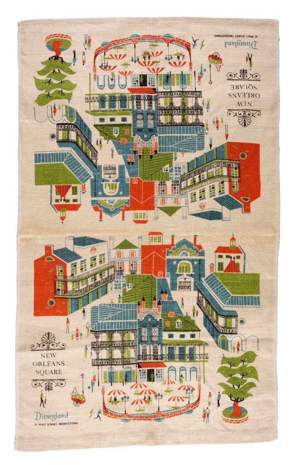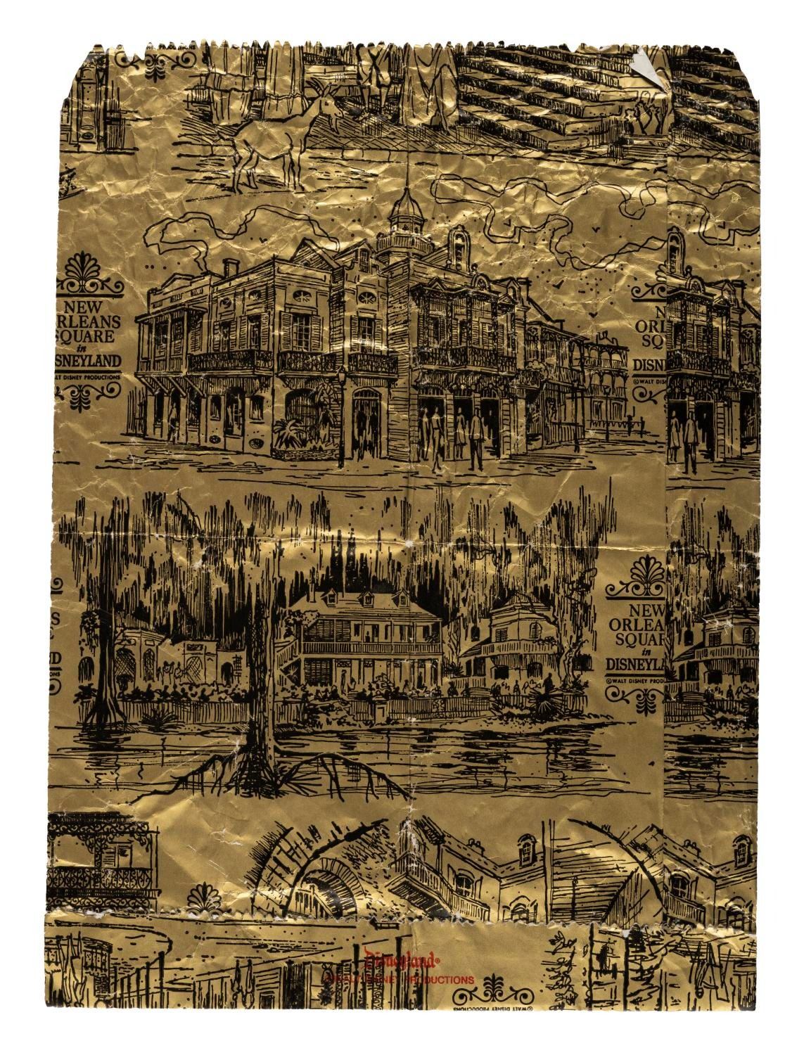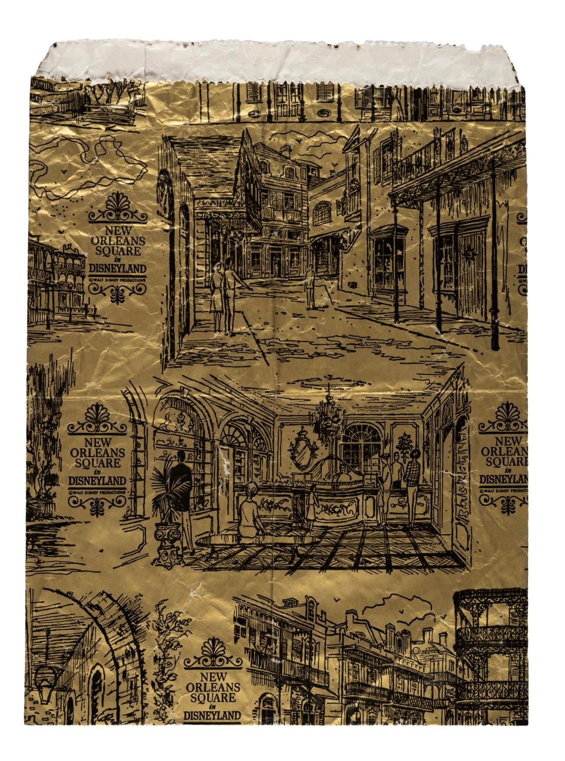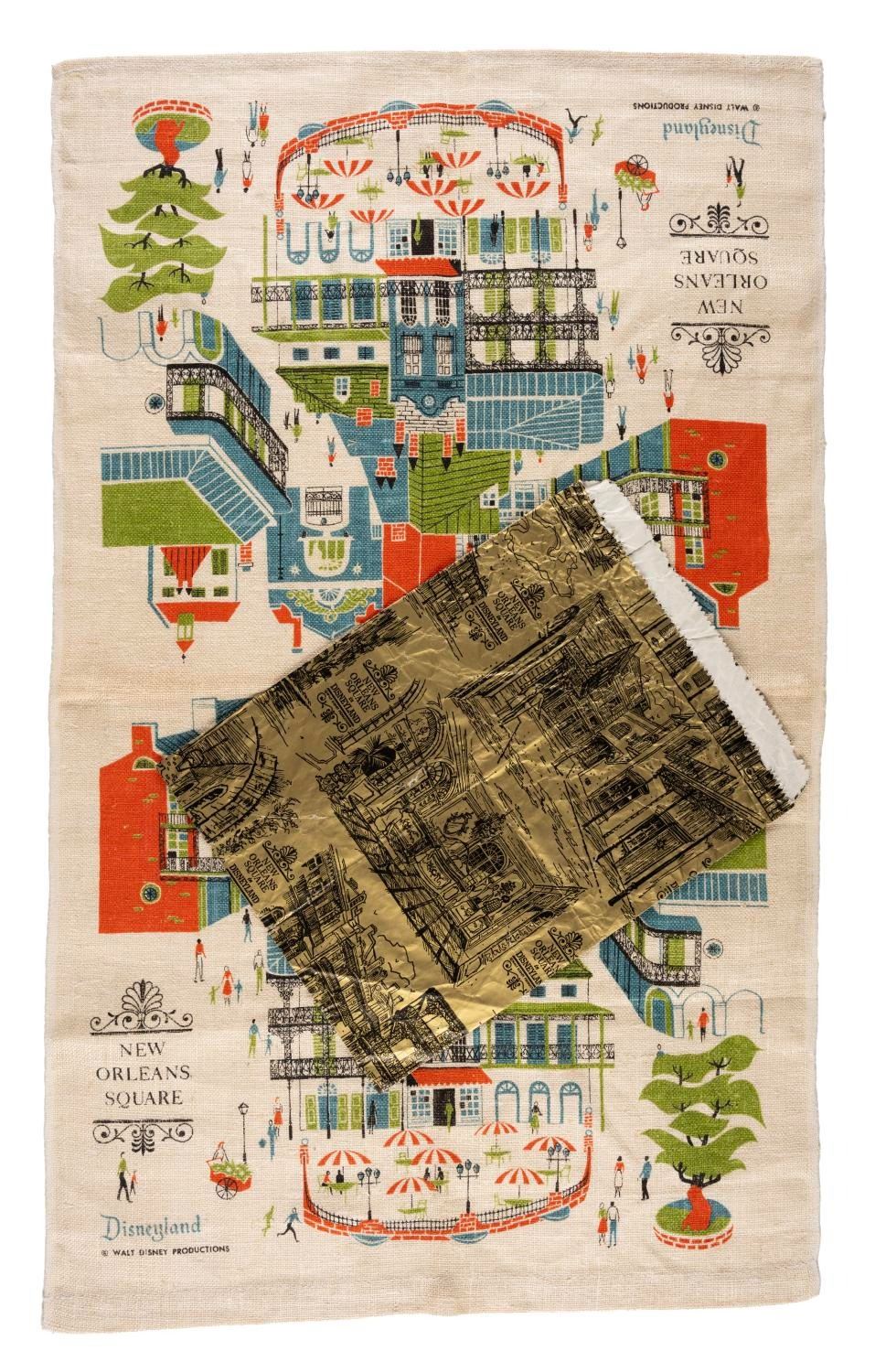 (Disneyland, 1969) A souvenir towel and bag from New Orleans Square at Disneyland, accompanied by a gold-toned New Orleans Square merchandise bag. Measuring approximately 30"x 17.5", the towel is in very good condition with minor wear. Measuring 8.5" x 11.5", the bag is in fair condition with creases throughout.