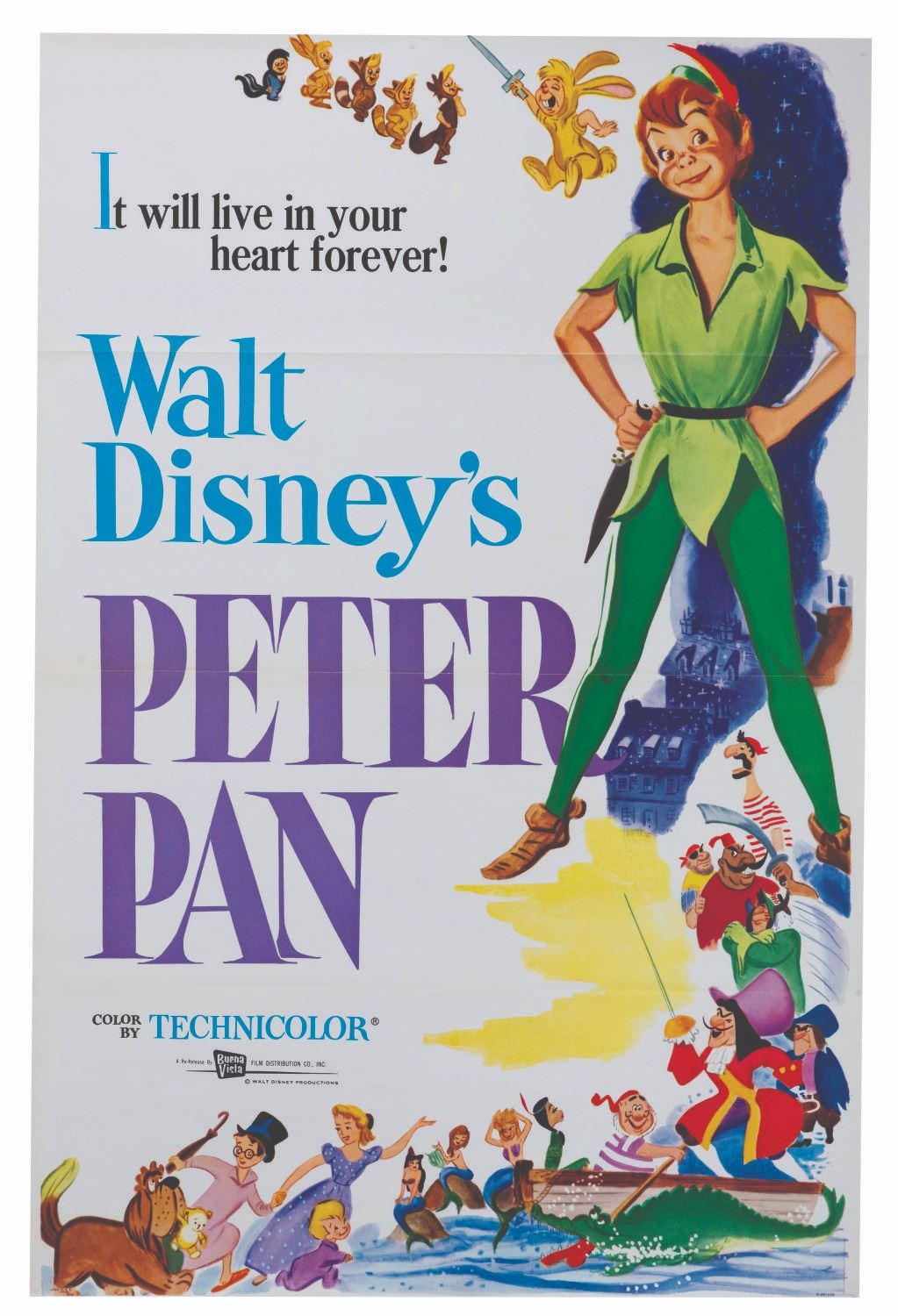 (Disney, 1969) A One Sheet Poster for the 1969 theatrical re-release of Walt Disney's"Peter Pan." Measuring 27"x41", the poster is in good condition, has been stored rolled, with wear along corners, edges, and original folds.