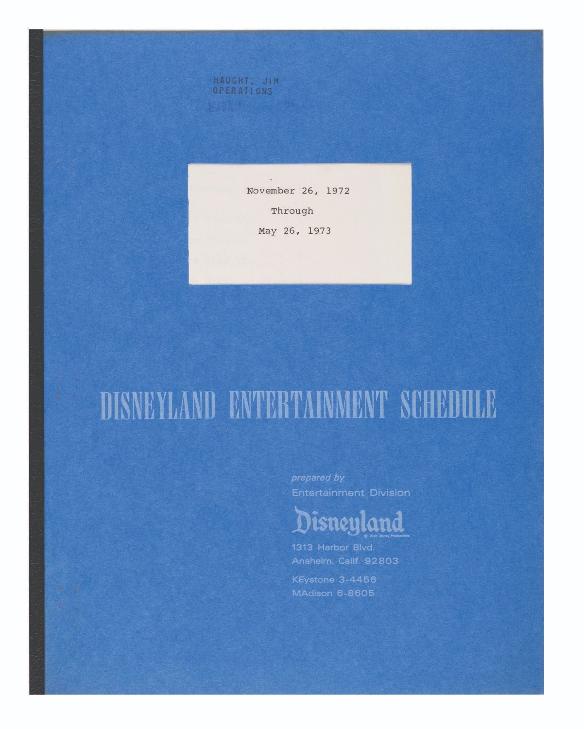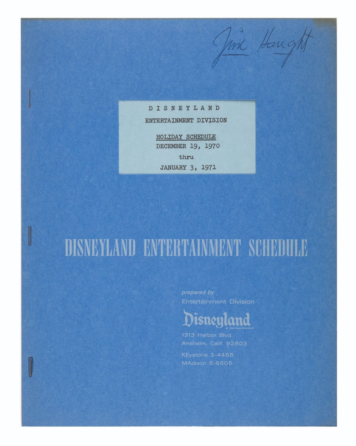 (Disneyland, 1970-71) A Disneyland Entertainment Holiday Schedule for December 19, 1970, through January 3, 1971. This 19-page schedule, created by the Entertainment Division, outlines entertainers for winter seasonal events, including the New Year's Eve Party, Fantasy on Parade, and Candlelight Processional. These internal documents offer a unique glimpse into the Park's backstage operations, as they were not intended for public distribution. Measuring 8.5” x 11”, the schedule is in fine, Park-used condition, with yellowing and wear to surfaces and edges, and the name"Jim Haught” (of Disneyland Operations) written on the cover.