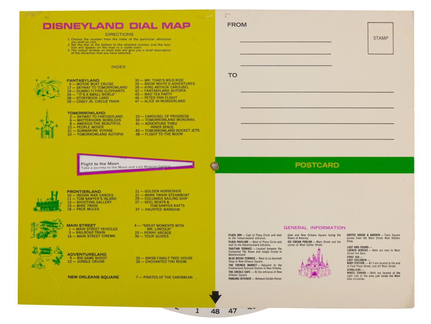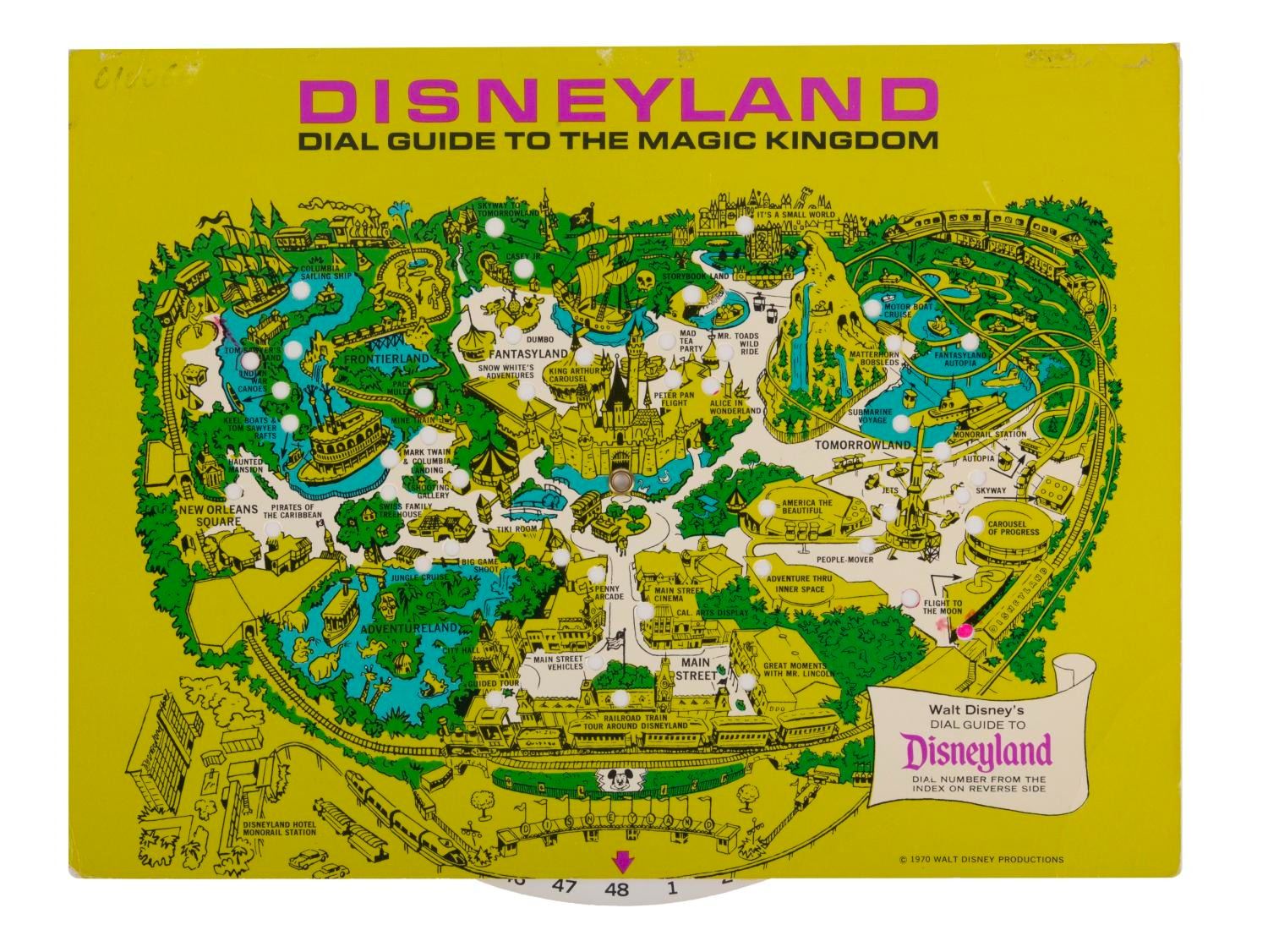 (Disneyland, 1970) A rotating dial guide featuring a map of Disneyland and a list of the Park's attractions. Each attraction is given a number on the back, and by spinning the dial, the map highlights the location of the selected attraction. Measuring 9"x 12", this guide is in good condition with a faded ink inscription, light scuffs on the front and back, a crease to the bottom right corner, and light wear from use.
