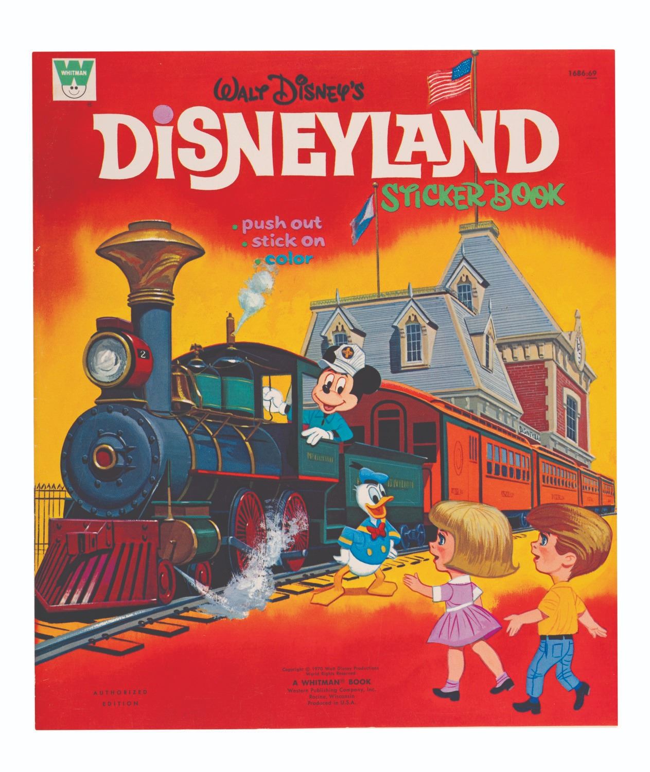 (Whitman, 1970) A complete Walt Disney's Disneyland sticker book featuring color illustrations of Disney characters and Park scenery. Measuring 10.5" x 12", the book is in very good condition with minimal edge wear, particularly on the spine, a few small creases, and scuffing on the back cover.