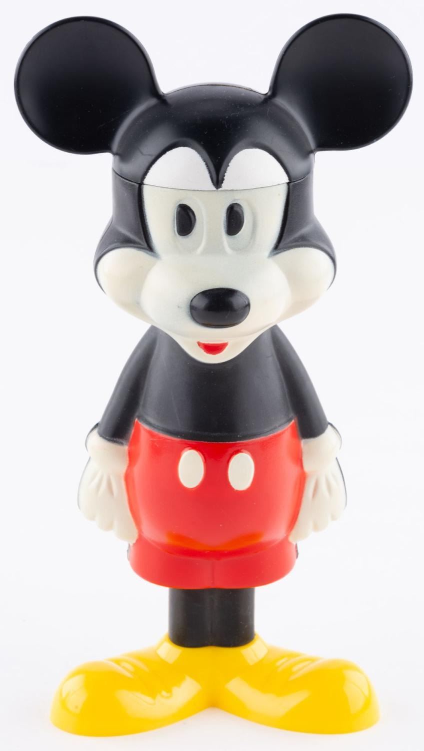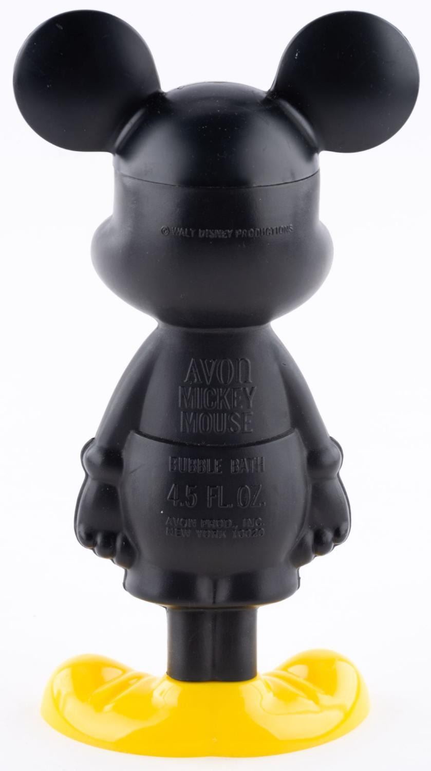 (Avon, 1970s) An original figural Mickey Mouse bubble bath with its original box and bubble liquid. Measuring 3.25" x 2.5" x 7" tall, the bubble bath is in very good condition with faint discoloration to the plastic from age. The box is in very good condition with typical wear mainly at the edges. The bubble liquid is for collecting purposes only, not intended for use.
