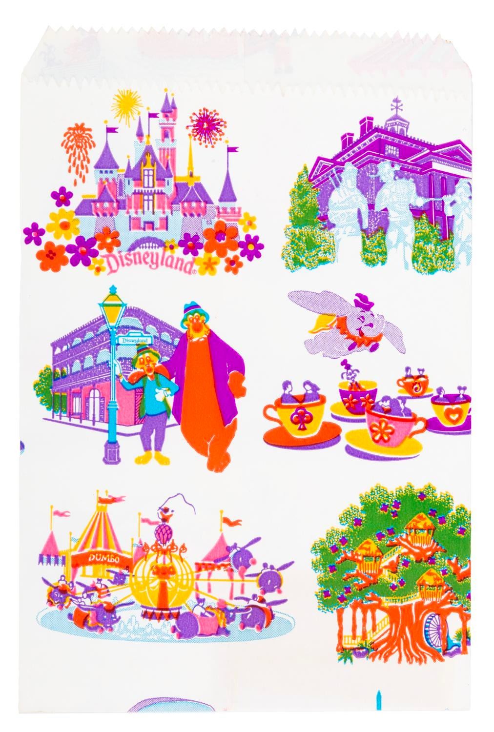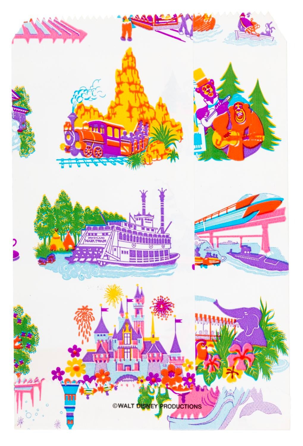 (Disneyland, 1970s) A merchandise bag from Disneyland featuring attractions including Pirates of the Caribbean, the Matterhorn, the Country Bear Jamboree, and more. Measuring 5.5” x 8.25”, the paper bag is in fine condition.