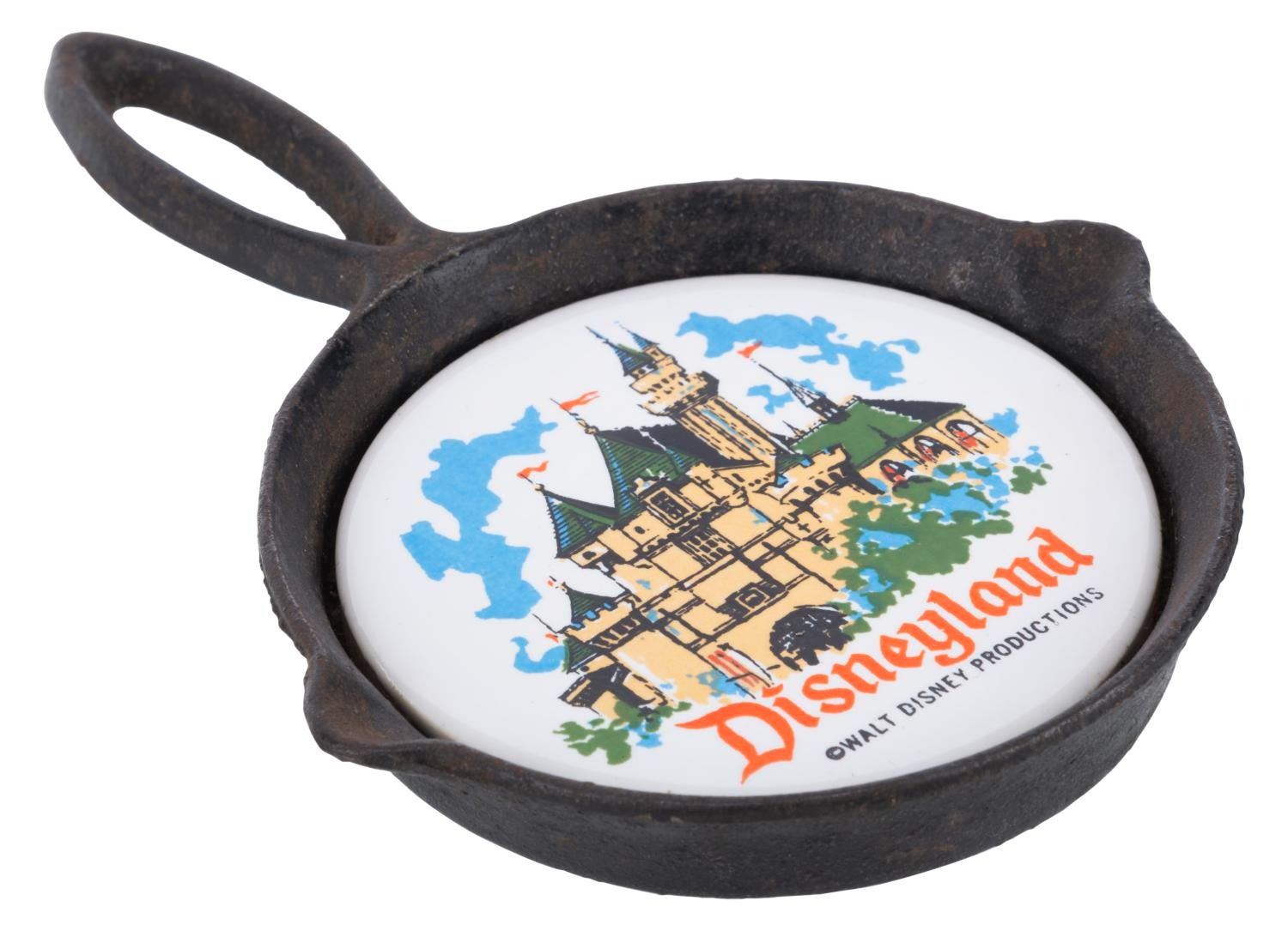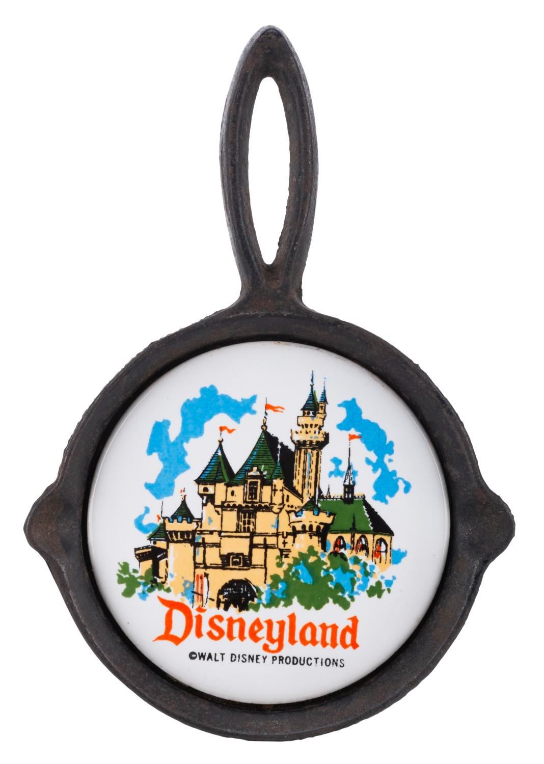 (Disneyland, 1970s) A Disneyland souvenir cast iron pan ashtray with a colorful Sleeping Beauty Castle at the center. Measuring 4.5” x 6.75”, the ashtray is in very good condition with light wear.