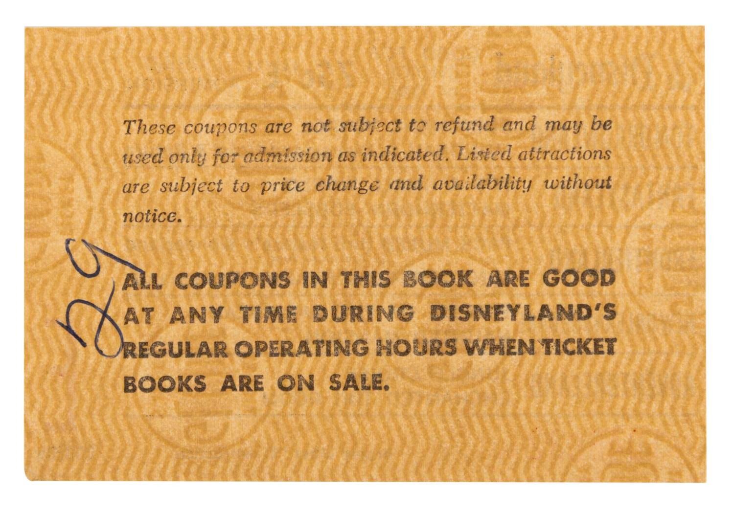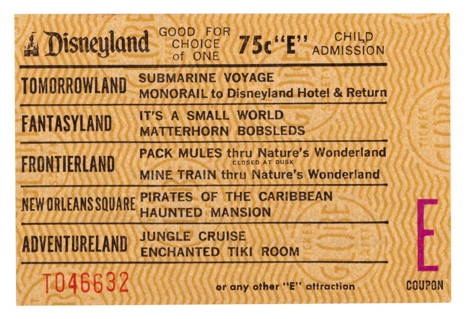 (Disneyland, 1970s) A Child admission "E" ticket from the early 1970s featuring The Haunted Mansion and Pirates of the Caribbean as the newest attractions to choose from, with a 75 cent value. Measuring 2.5" x 3.75", the ticket is in very good condition with light edge wear and the number "29" in ink on the back.