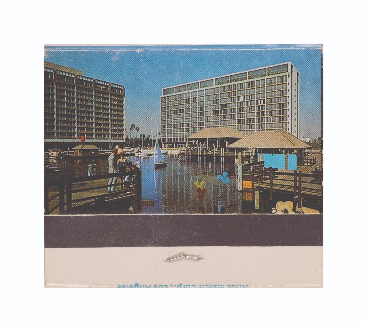 (Disneyland, Hotel, 1970s) A complimentary matchbook from the Disneyland Hotel, featuring the Monorail and Marina. Measuring 2" x 2", the piece is in very good condition with light wear.
