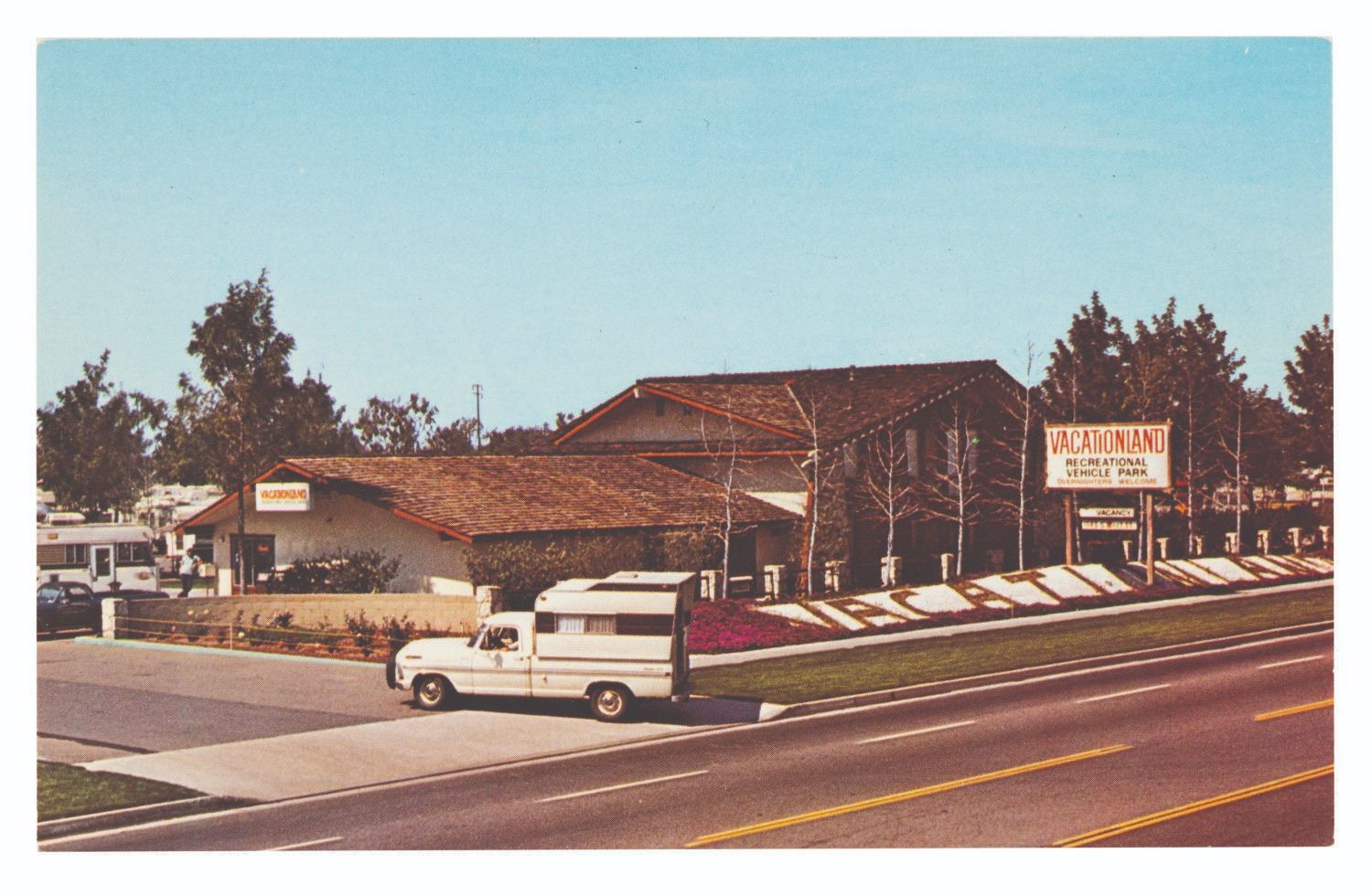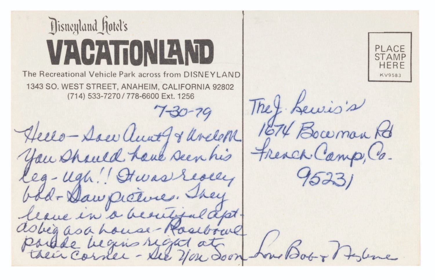 (Disneyland Hotel, 1979) An original Vacationland Recreational Vehicle Park postcard. The postcard is inscribed but not mailed. Measuring 5.5" x 3.5" it is in good condition with slight discoloration from age and slight edge wear.