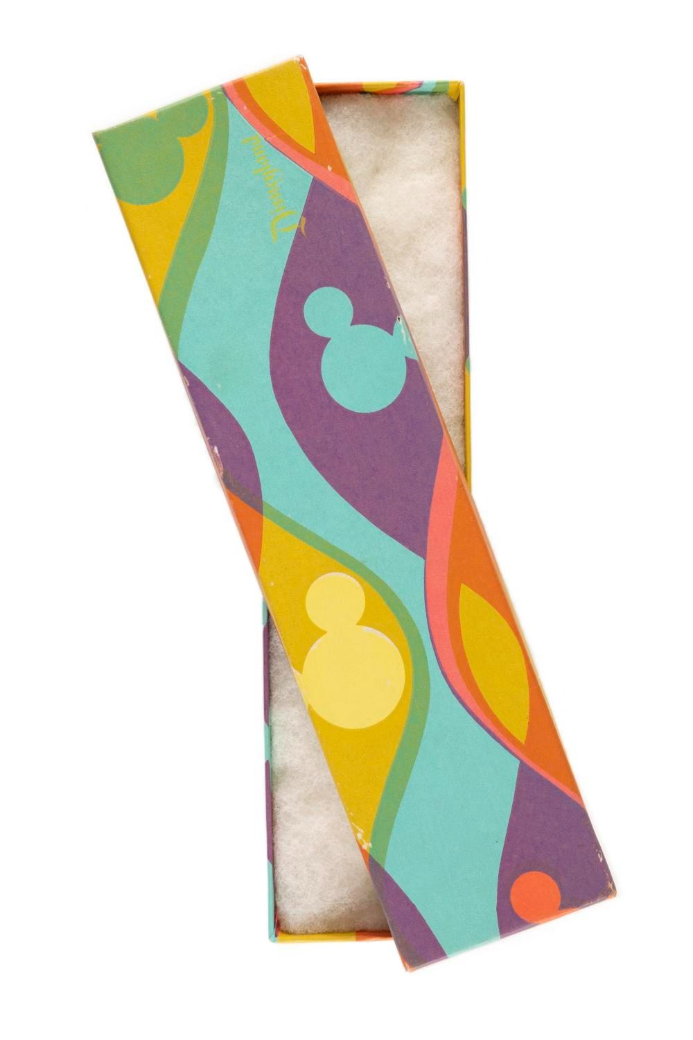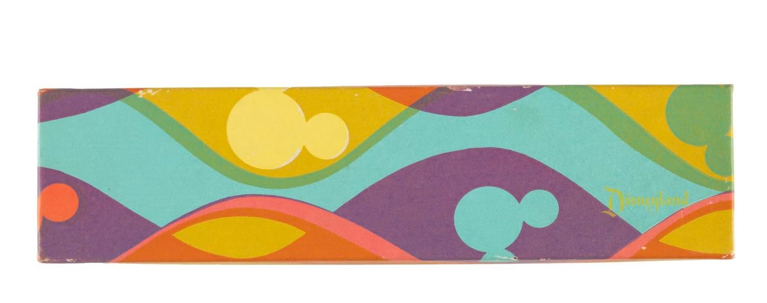 (Disneyland, 1970s) A 1970s Disneyland jewelry gift box featuring Mickey Mouse heads and the "Disneyland" name. Measuring 8.75"x2.25"x1", this cardstock box is in very good condition exhibiting minor fading and surface wear.