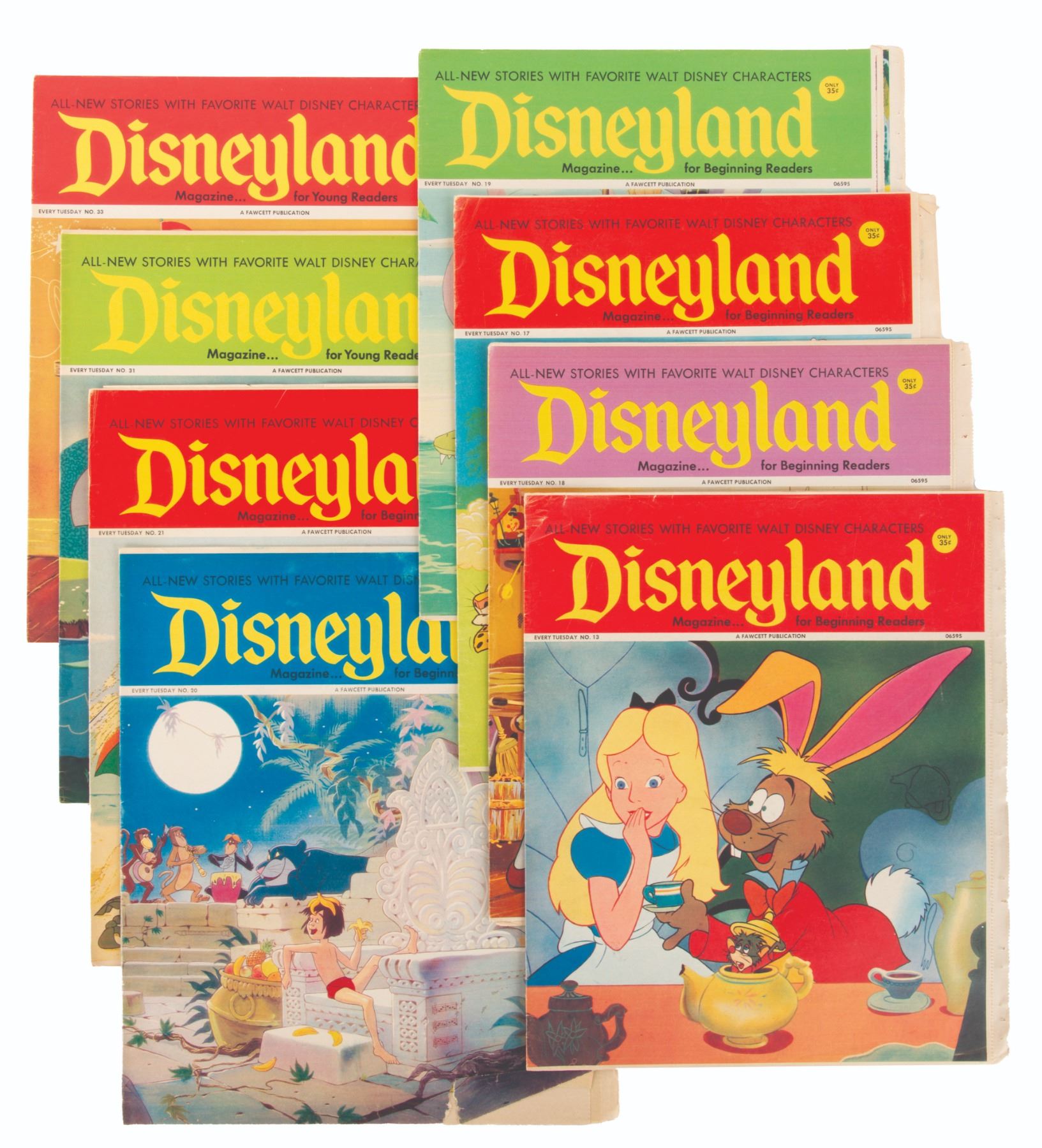 (Fawcett, 1971-72) A collection of 8 issues of "Disneyland Magazine... for Beginning Readers," including no. 13, 17-21, 31, and 33. Measuring 11" x 13" the weekly periodicals are in good to very good condition, with slight wear to some edges and spines.