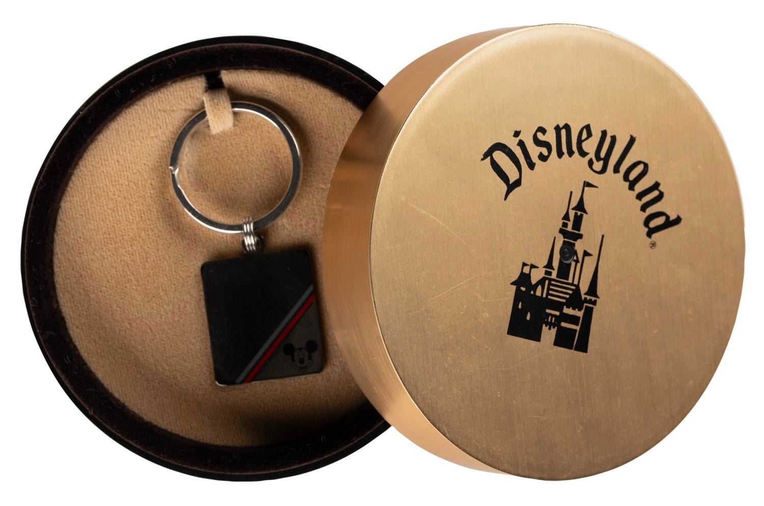 (Disneyland, 1970s) A stylish metal keychain featuring a subtle Mickey Mouse face in the corner, with a round plastic Disneyland box. The 2.5" keychain and 3.5" diameter box are in very good condition with light handling wear.