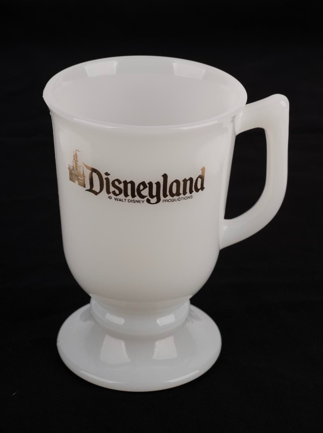 (Disneyland, 1970s) A Disneyland milk glass pedestal mug. These were typically personalized with a name beneath the logo. Measuring 4.5" x 5.25" high, the mug is in very good condition with typical light wear.