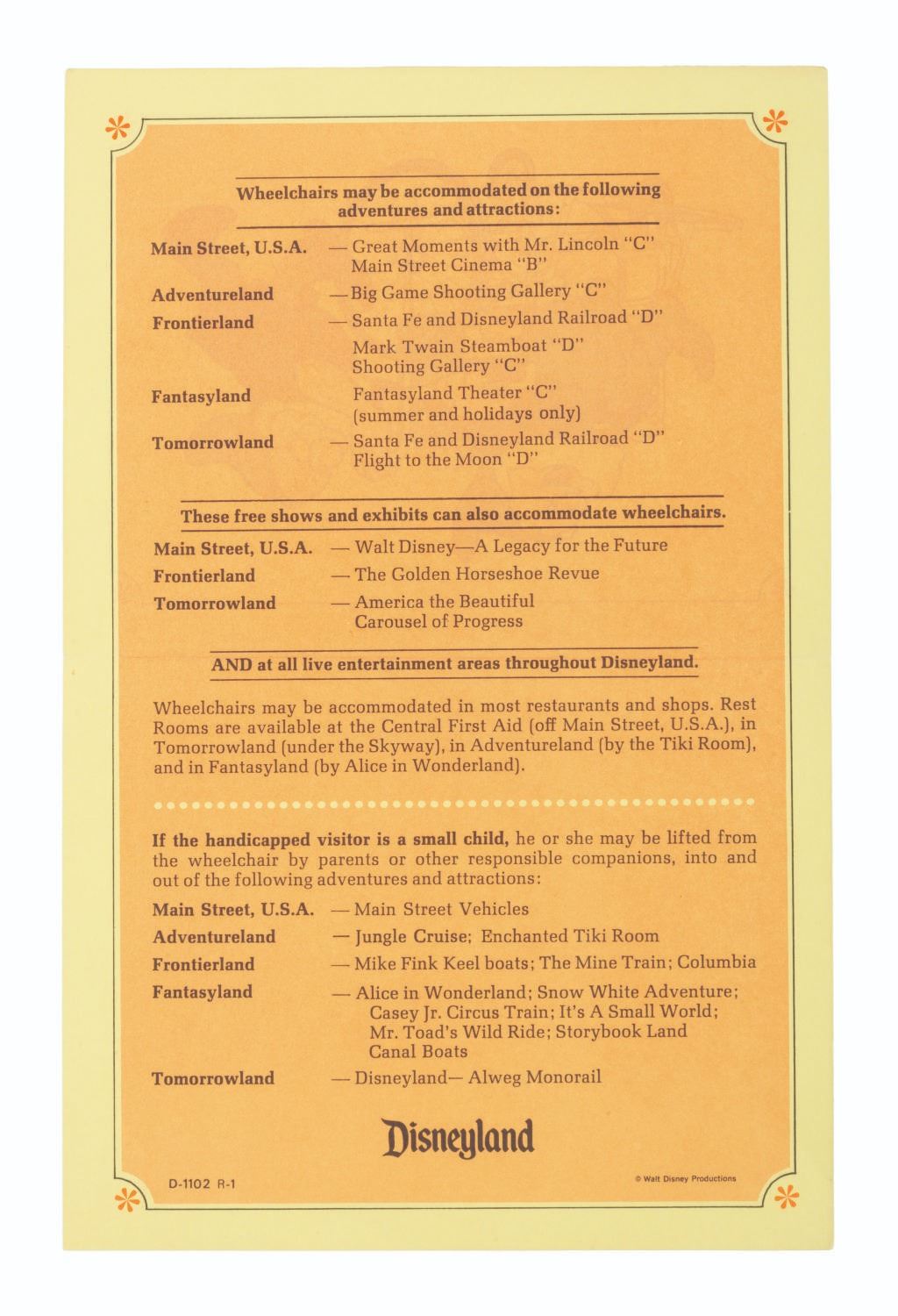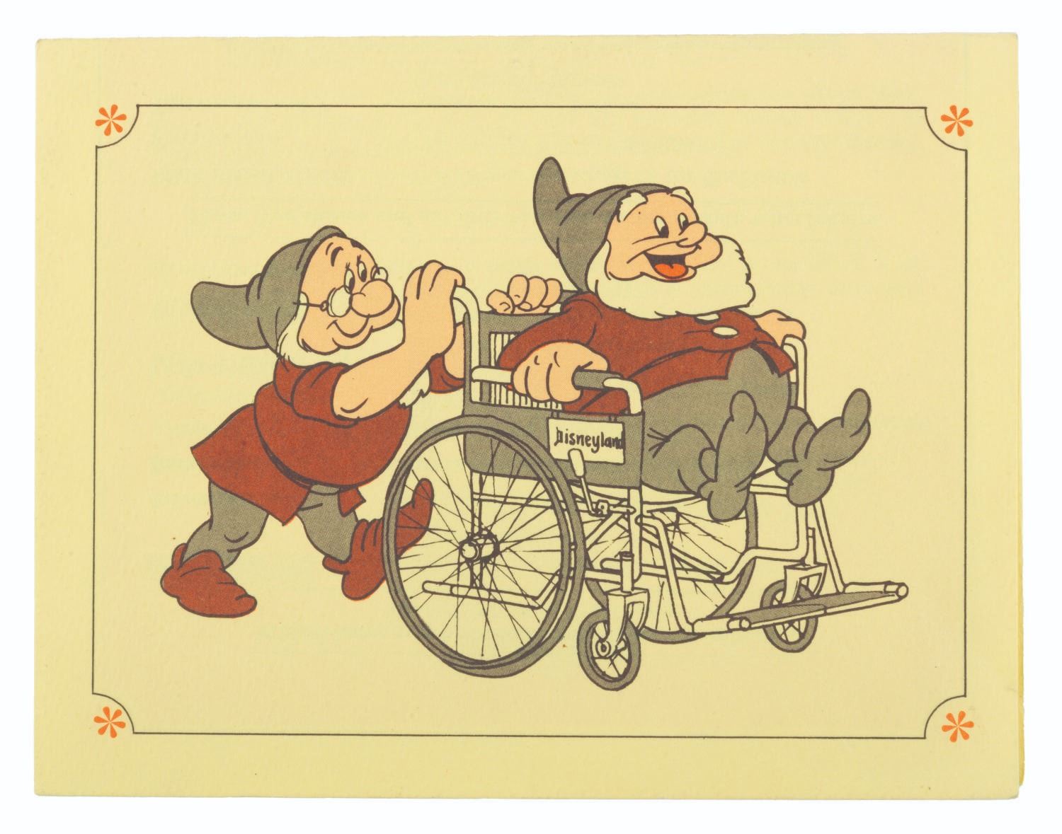 (Disneyland, 1970s-82) A brochure outlining the limited accommodations for wheelchair accessibility available in Disneyland in the 1970s and early 1980s. Measuring 4.25” x 5.5”, the brochure is in very good condition with light handling wear.