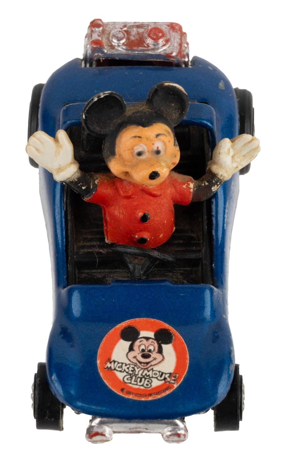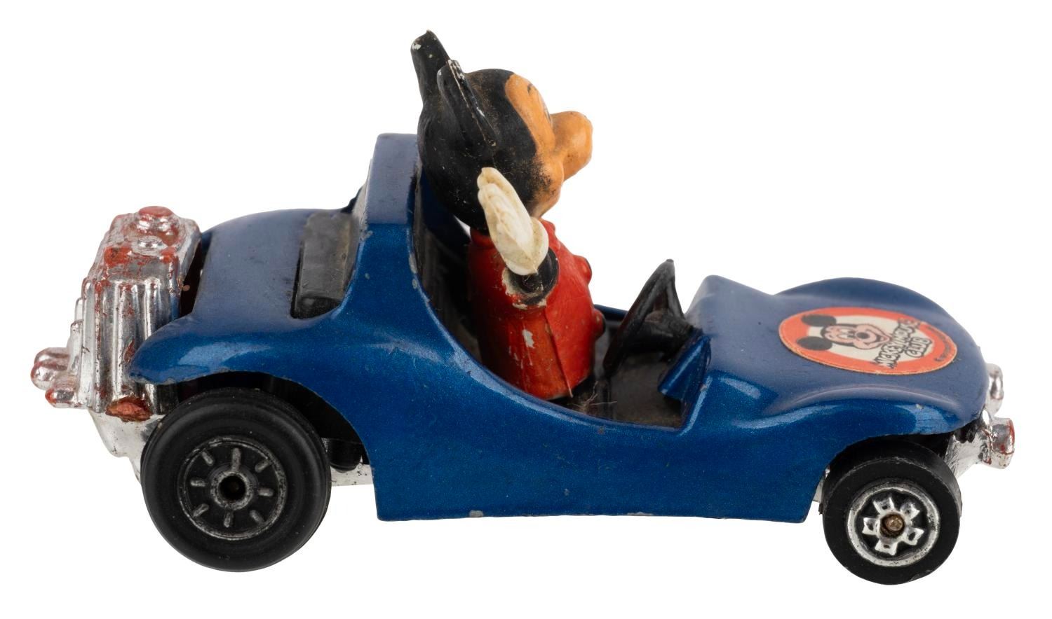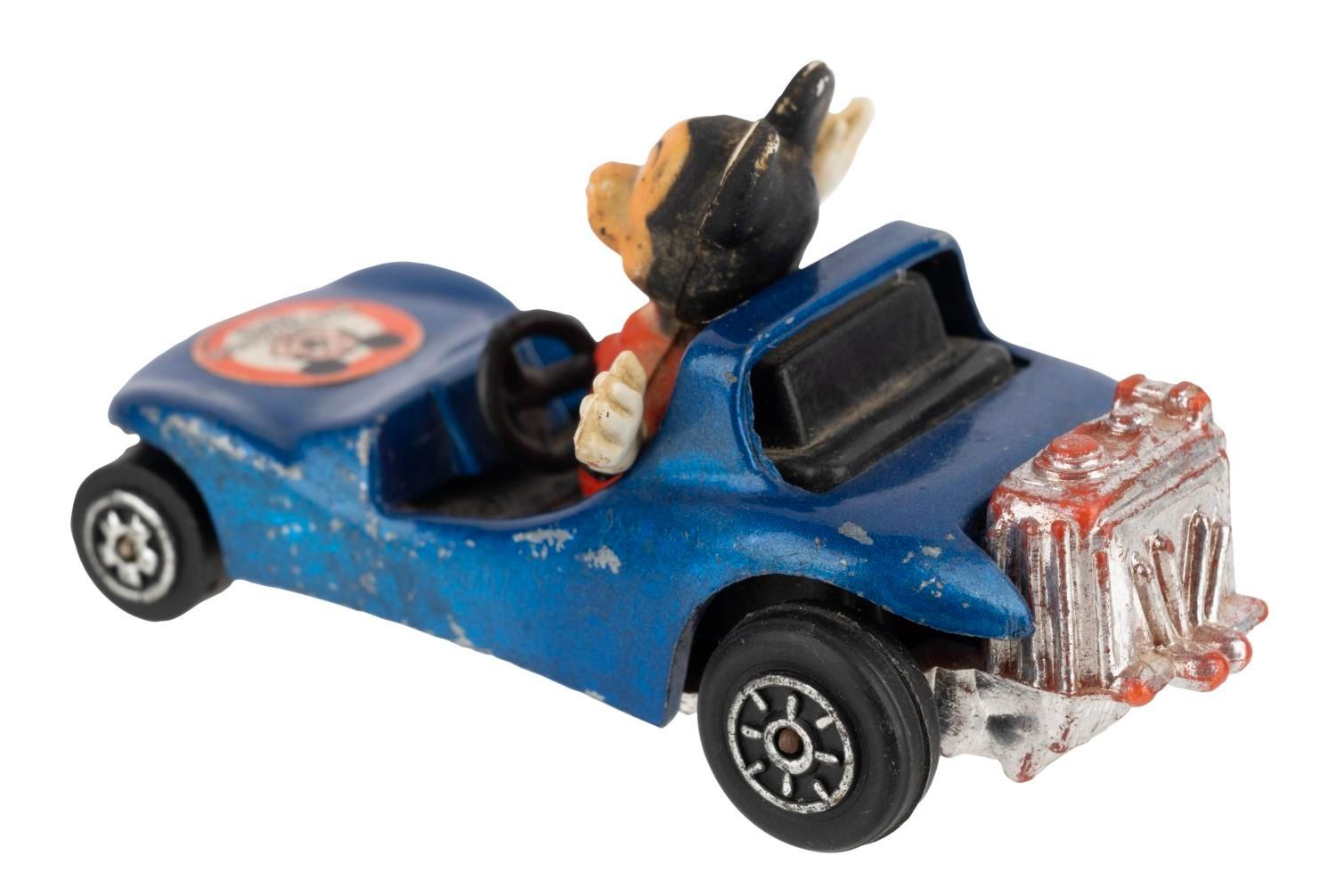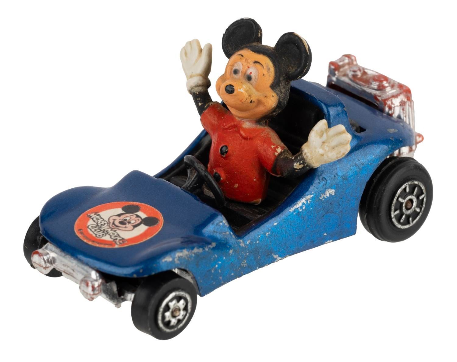 (Azrak Hamway, 1977) A Mickey Mouse Buggy Toy by Azrak Hamway International. Measuring 2.75" long and 1.5" tall, the toy car is in good condition exhibiting faint scuffs and wear and a slightly loose figure.