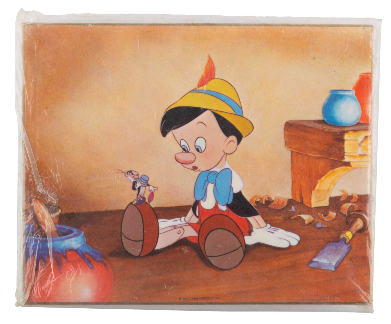 (Disney, 1970s) A wall plaque featuring an image of "Pinocchio," still sealed in the original cellophane with the original Disney price tag. Measuring 8" x 10" the plaque is in fine condition.