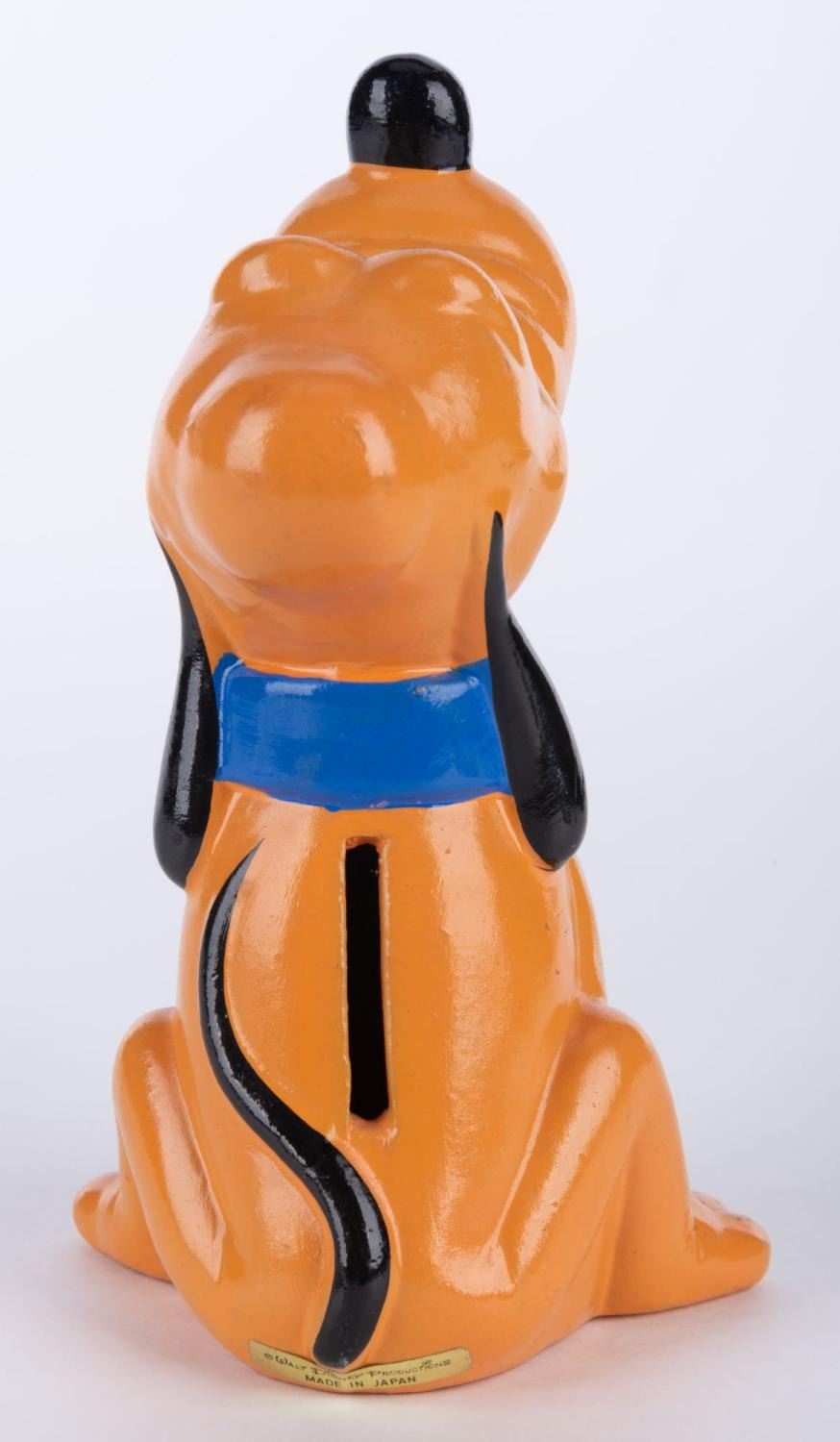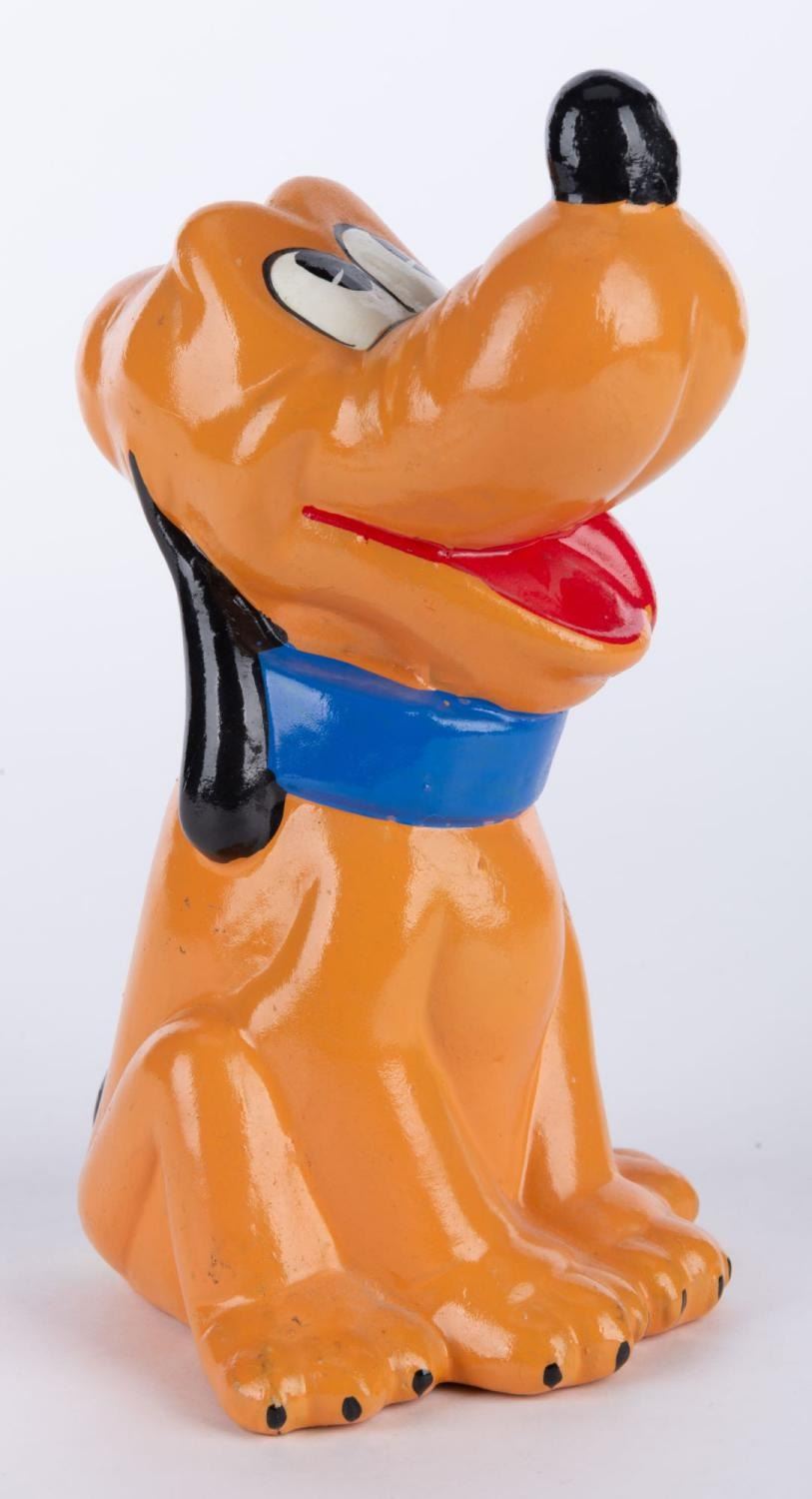 (Disney, 1970s) A ceramic coin bank of Walt Disney's Pluto. Measuring 6.5" tall, the bank is in good condition with surface wear and minor production imperfections to the glaze.