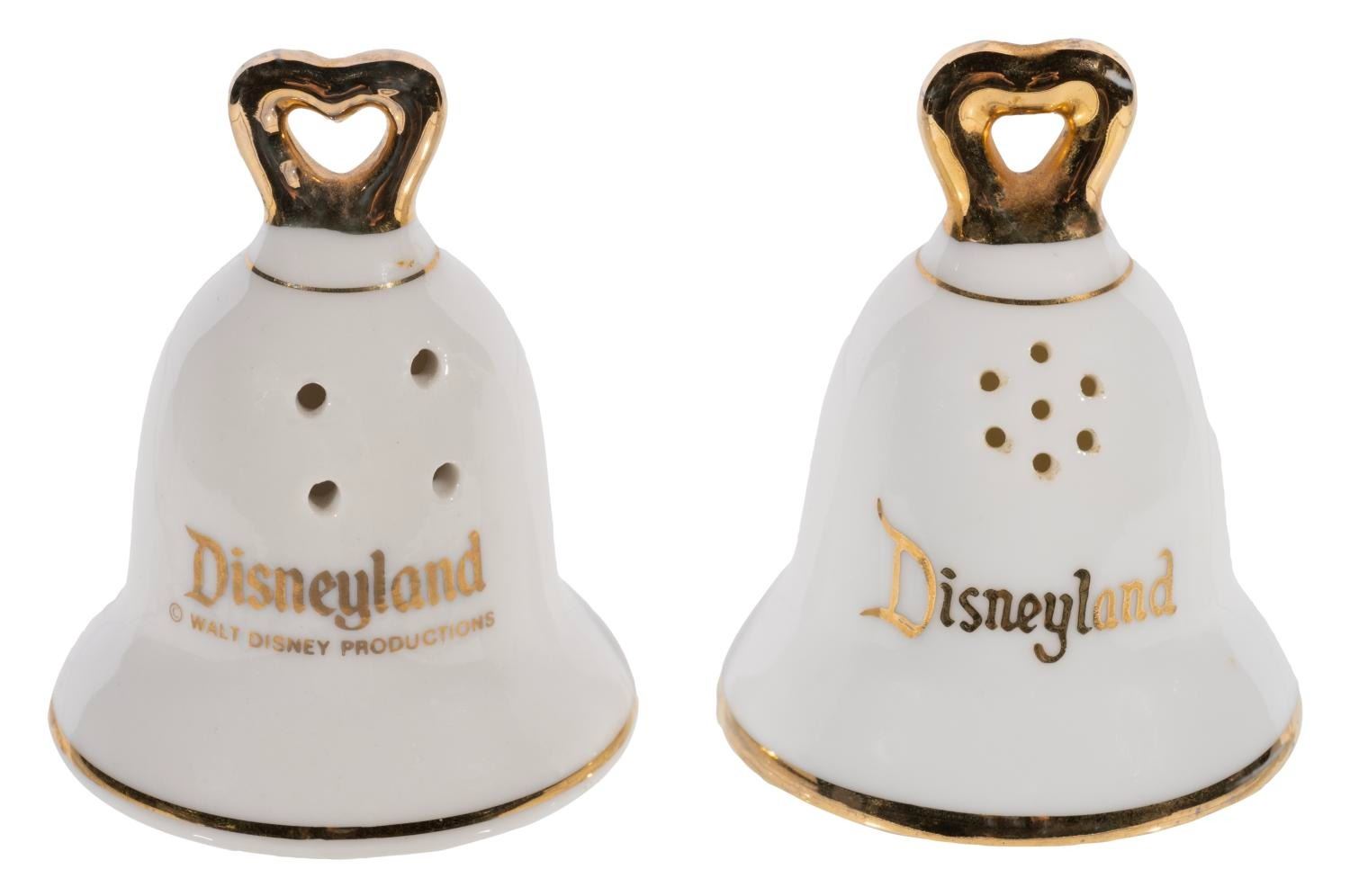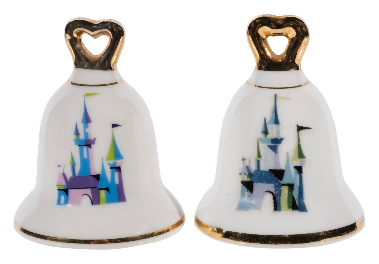 (Disneyland, 1970s) A bell-shaped Sleeping Beauty Castle souvenir salt and pepper shaker set from Disneyland. Measuring 2"x2.25", each ceramic piece is in very good condition, with wear to the gold-toned accents.