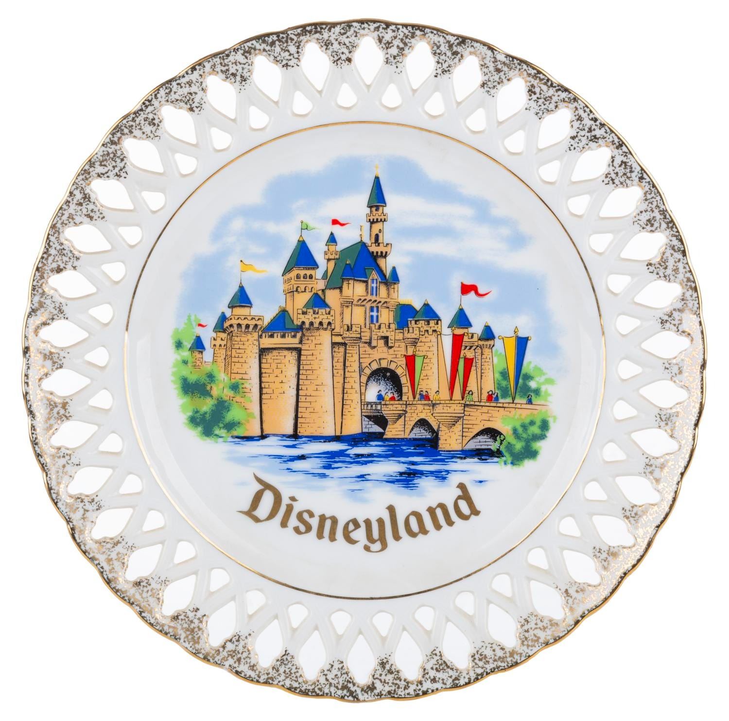 (Disneyland, 1970s) A souvenir decorative lace plate featuring Sleeping Beauty Castle. Measuring 9.25” in diameter, the plate is in very good condition with light scratches, discoloration, wear, and its original pricing sticker intact on the reverse.