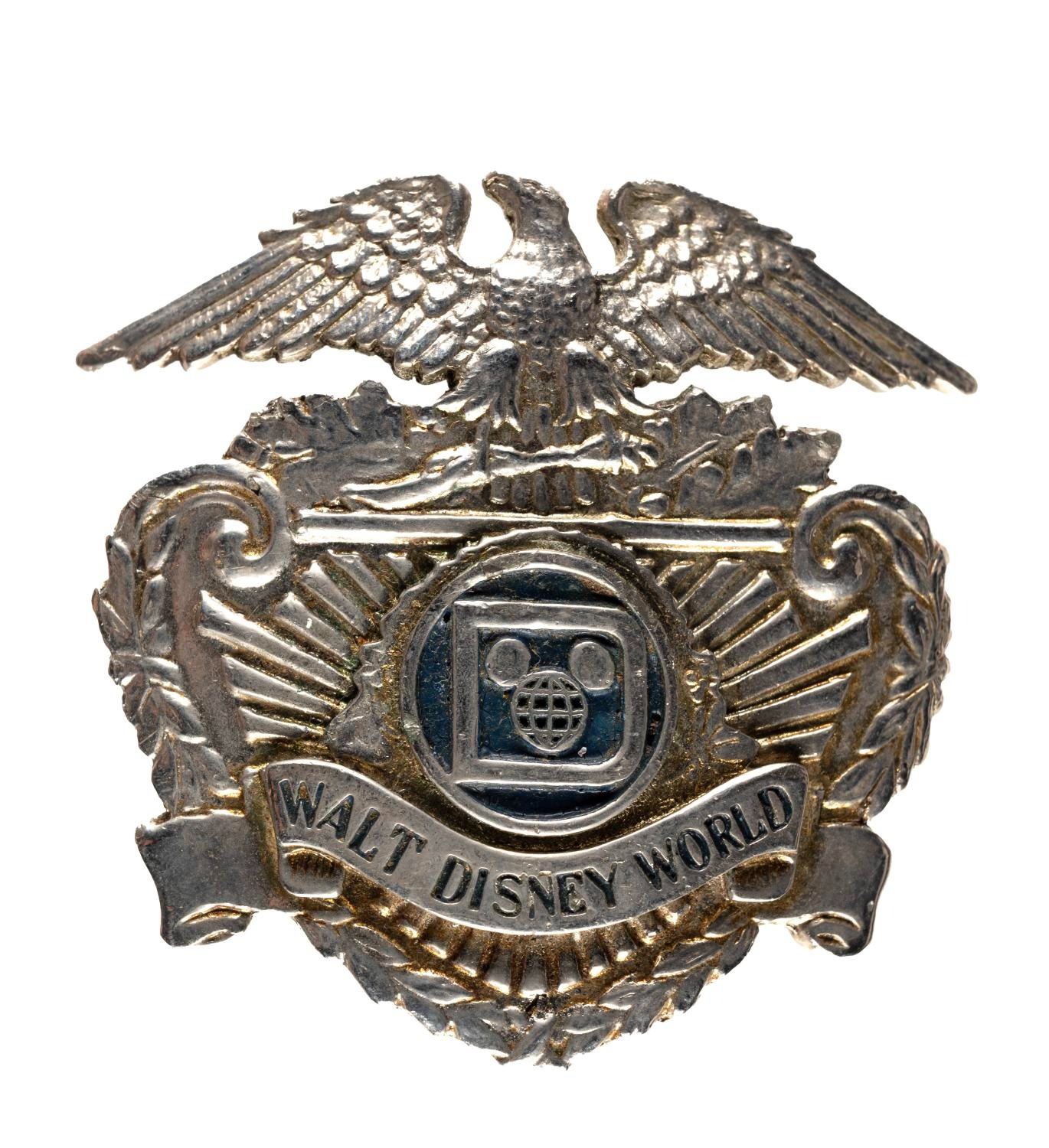 (Walt Disney World, 1970s) A badge worn by security officers at Walt Disney World, featuring the original Walt Disney World logo. The badge measures 2.25"x2.5" and is in very good condition with some expected surface wear, and the original pin has been replaced with a plastic pin fixture.
