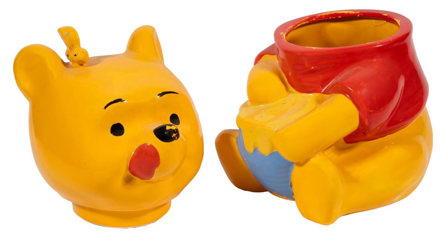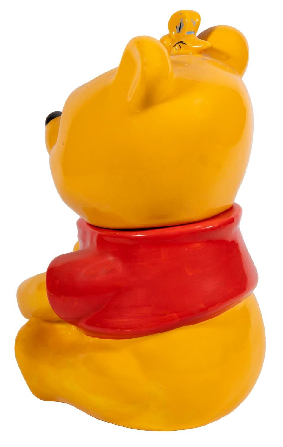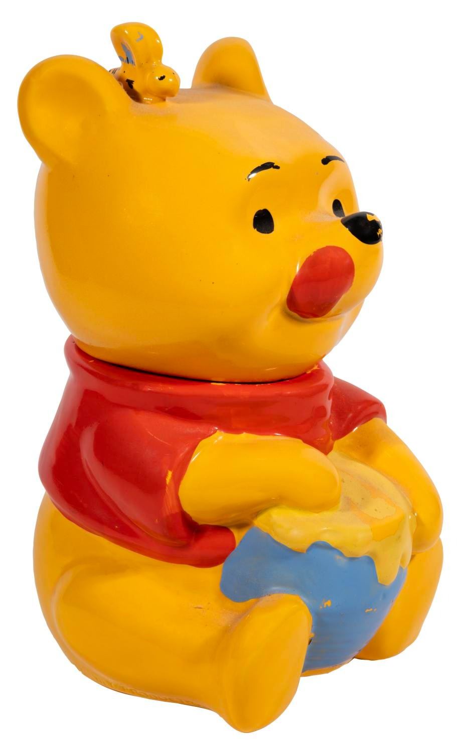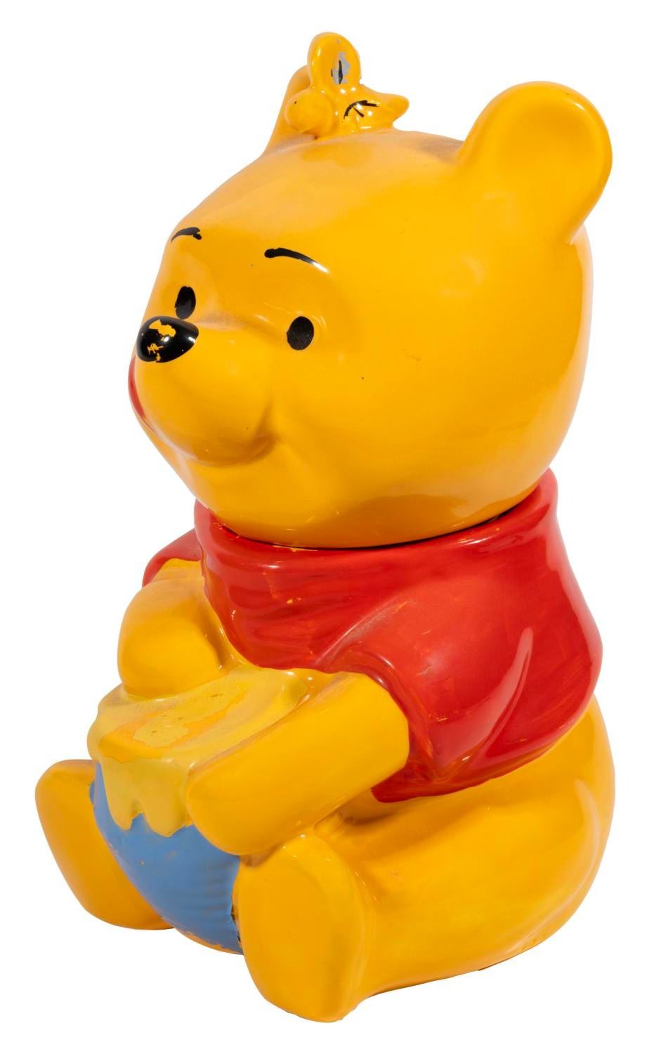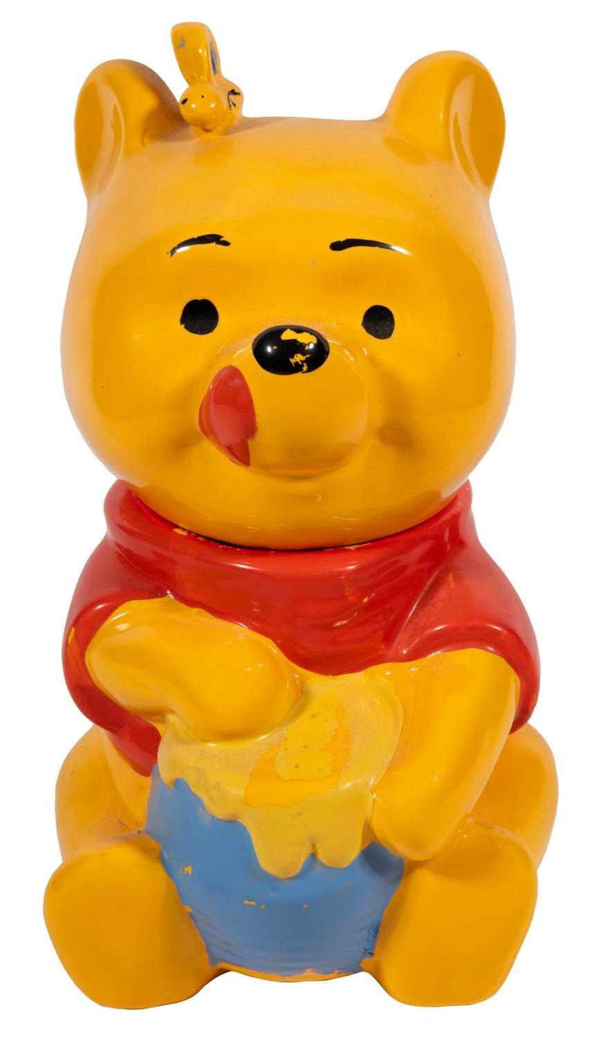 (Disney, 1970s) A ceramic Winnie the Pooh cookie jar. Measuring 12.75" tall and 7" in diameter, the hand-painted jar is in fair-to-good condition with chips, scuffs, and wear to the paint and glaze, and faint crazing throughout.