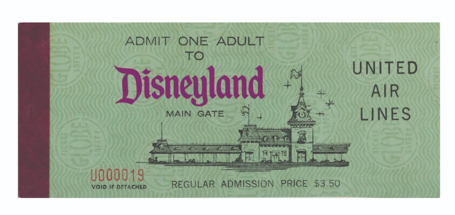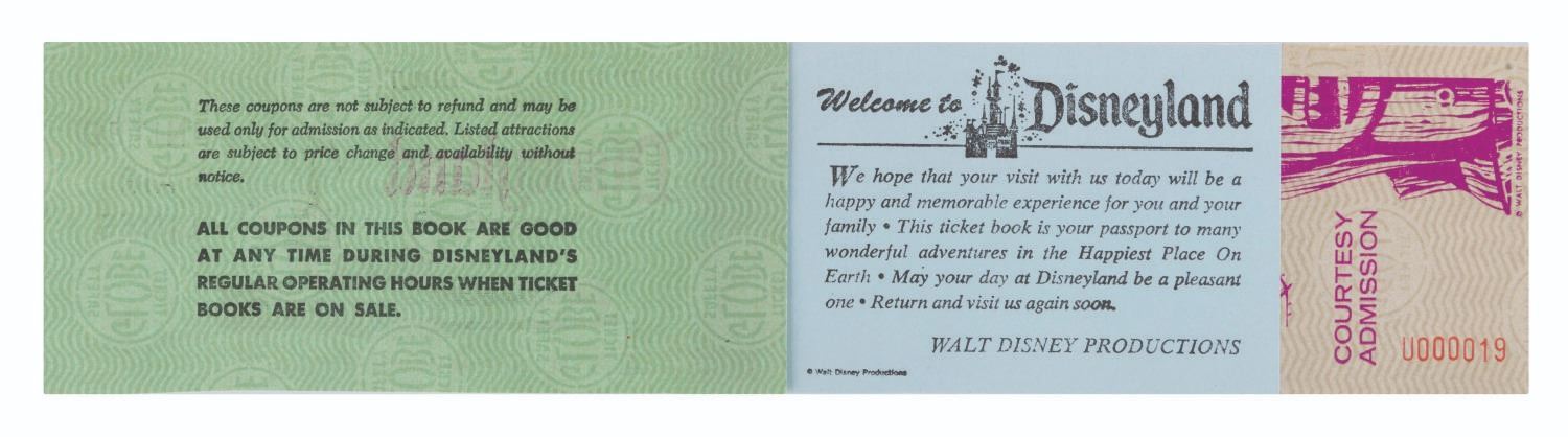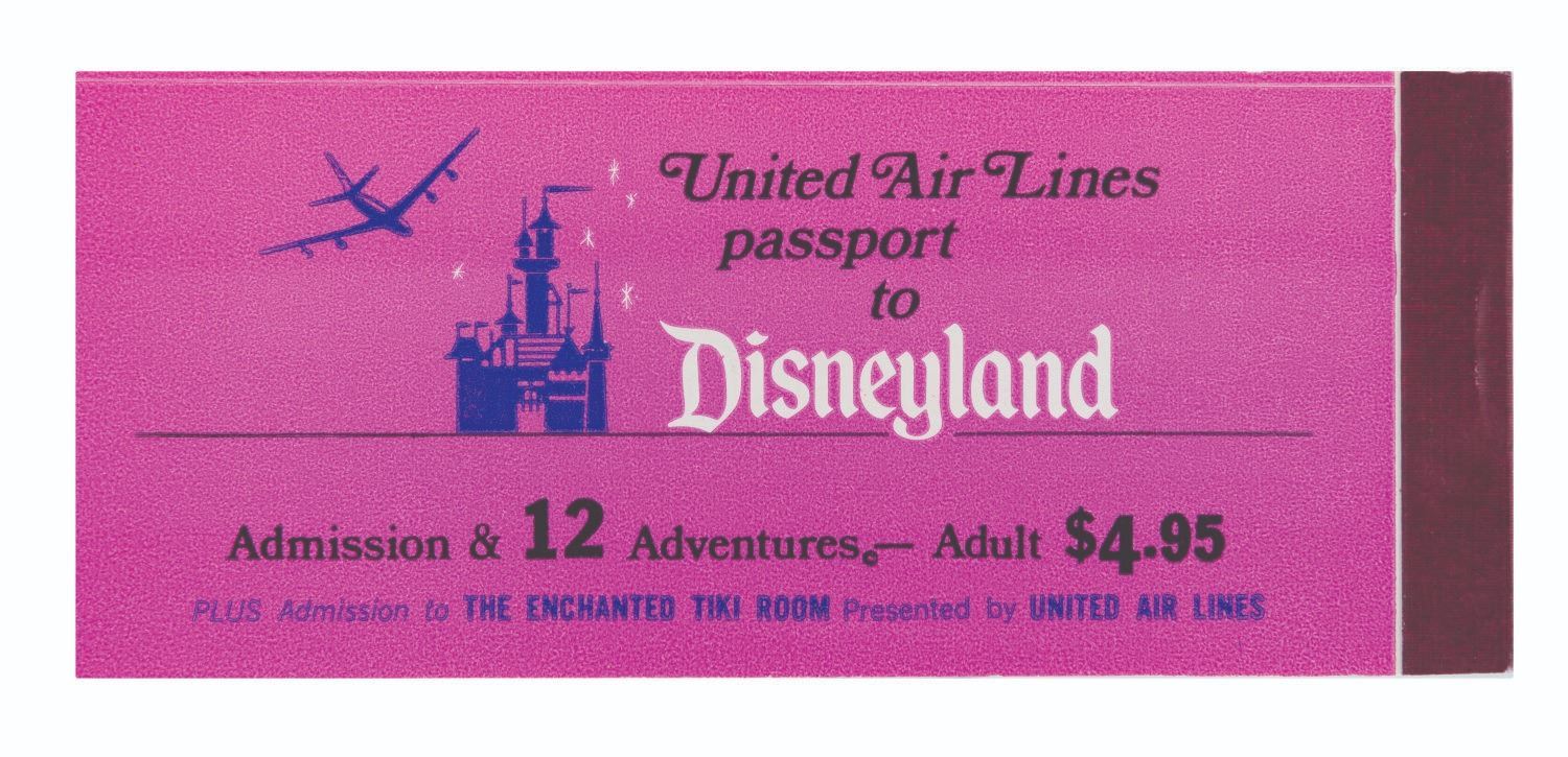 (Disneyland, 1972) A rare complete United Air Lines Adult 12 Adventure passport with complimentary Enchanted Tiki Room ticket. This book includes the front Main Gate ticket, Welcome to Disneyland tab, the Tiki Room ticket, 4 “E” tickets, 3 “D” tickets, 3 “C” tickets, 1 “B” ticket, and 1 “A” ticket. Numbered “U000019,” the 2.5” x 6” ticket book is in fine condition.
