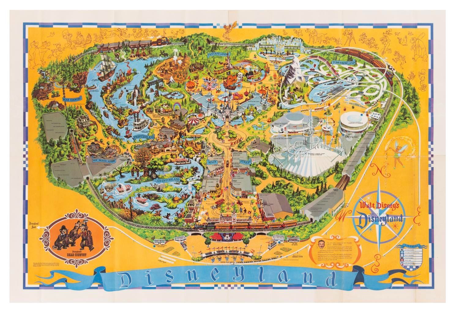 (Disneyland, 1972) A large souvenir map of Disneyland from 1972. This edition of the Disneyland map contains the newly opened Elgin's New Century Clock Shop, Crystal Arts (misspelled “Cristal Arts”), and the new Country Bear Jamboree attraction where the Indian Village once stood. Measuring 30" x 45", the map displays in very good condition with light creases, spotting, wear along the original folds, and discoloration around the border from age.