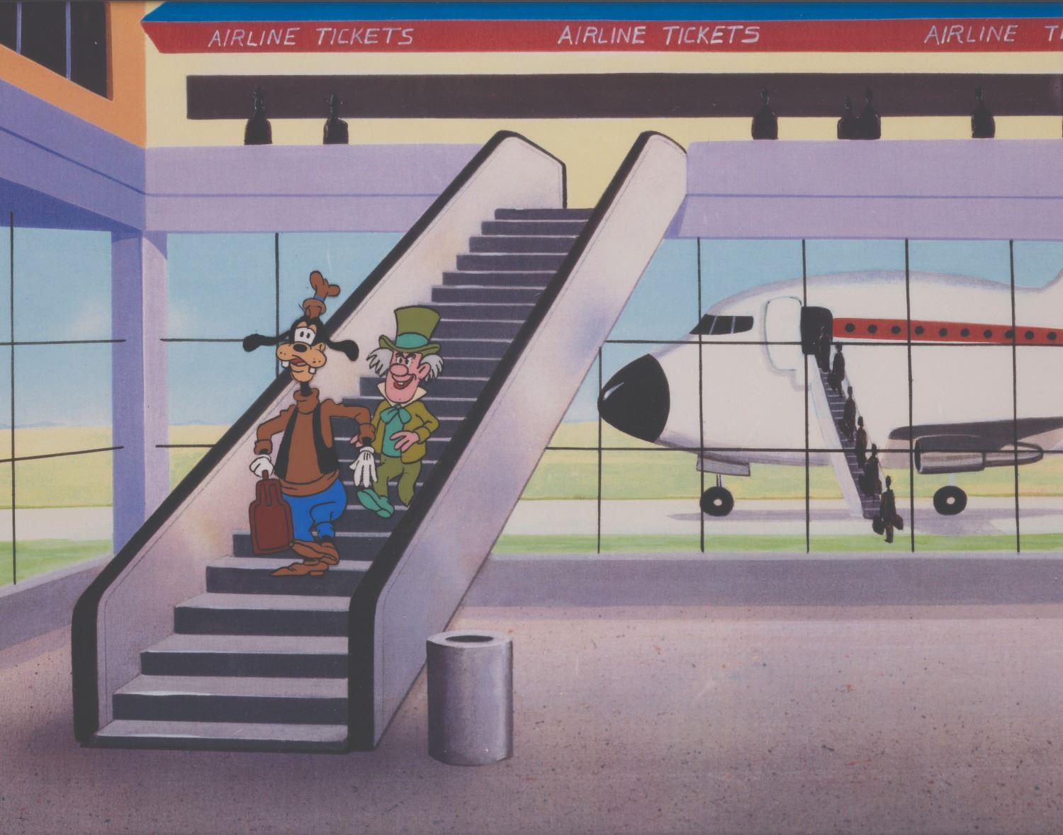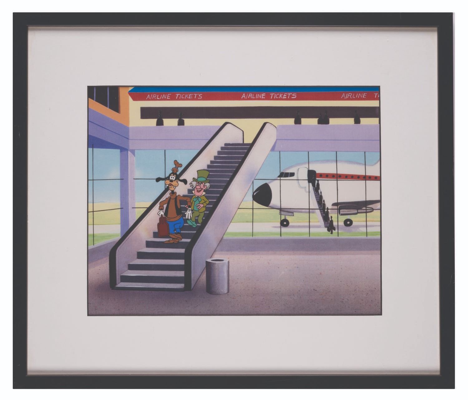 (Eastern Airlines, 1972) A production cel of Goofy and the Mad Hatter from a 1972 Eastern Airlines commercial. The one-minute ad boasted that Eastern was the official airline of Walt Disney World in narration by Orson Welles, over animation of Disney characters traveling to Orlando. This cel of Goofy and the Mad Hatter appears late in the spot as they disembark the plane. With a character image size of 2.5" x 3.75" on an untrimmed 10" x 12" cel, the piece is in very good condition, presented with a thematically matching background.