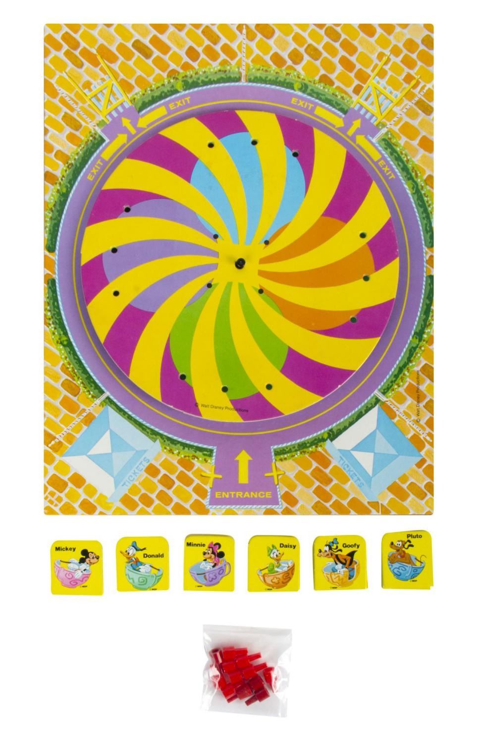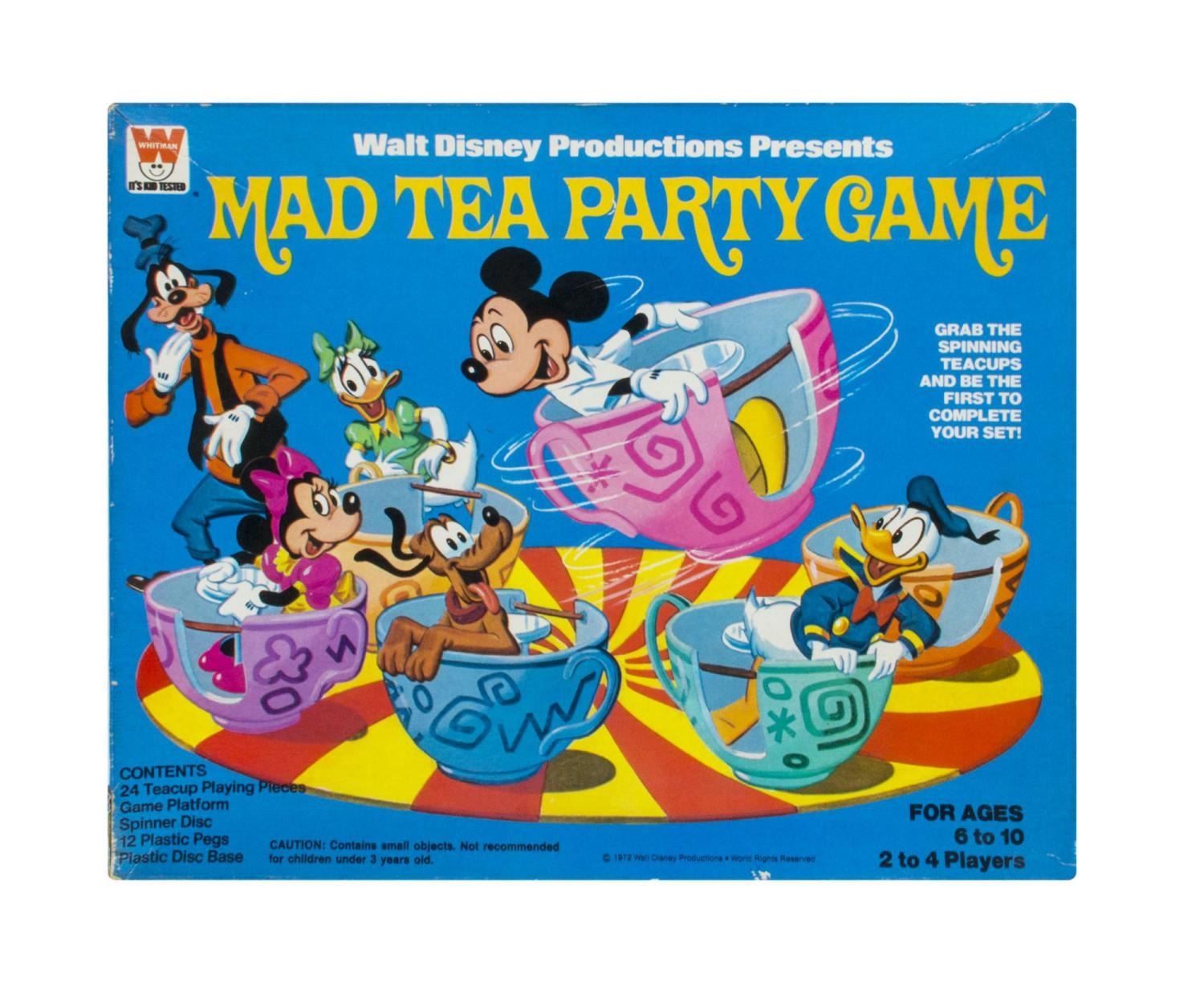 (Whitman, 1972) A Walt Disney Productions Presents Mad Tea Party Game. This game of spinning teacups featuring Disney characters is based on the popular Disney Parks attraction. This game is complete with 24 Teacup Playing Pieces, Game Platform, Spinner Disc, 12 Plastic Pegs, and Plastic Disc Base. In the 14.25"x11.5"x1.75" box, this game is in good condition with creases, scuffs, and wear.