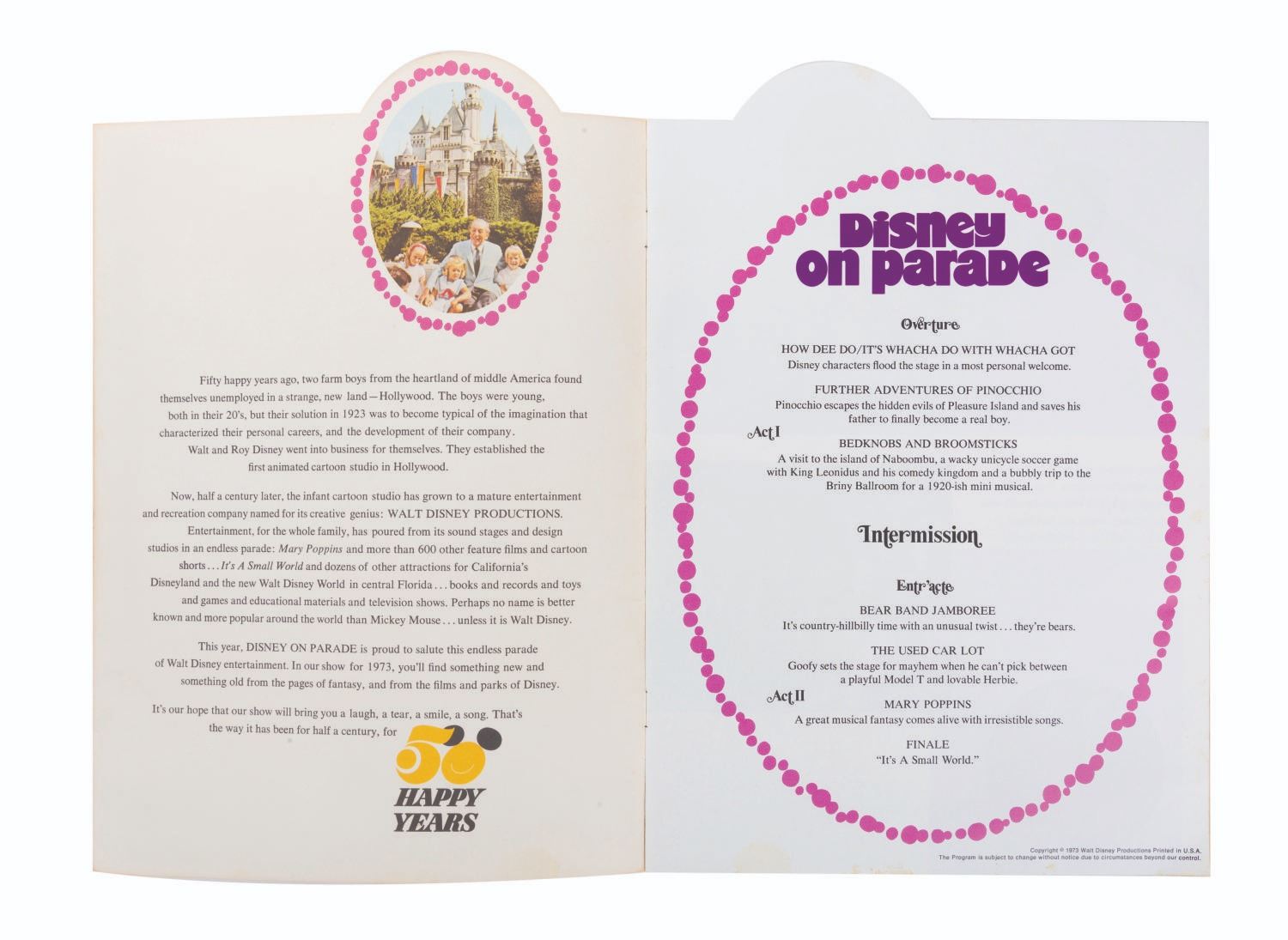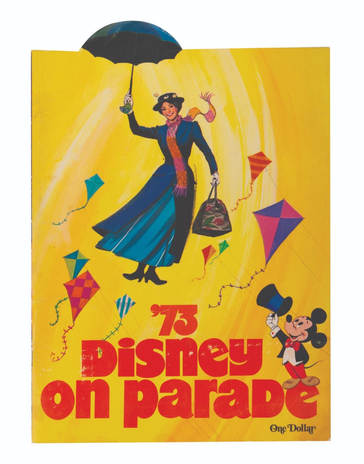 (Disney, 1973) A rare souvenir program from the spectacular "Disney on Parade" which performed at arenas across the United States. This 20 page program contains photos and information on the show. Measuring 8.5" x 12", the program is in good condition with wear from handling mainly to the cover, including small scuffs and creases to the spine.