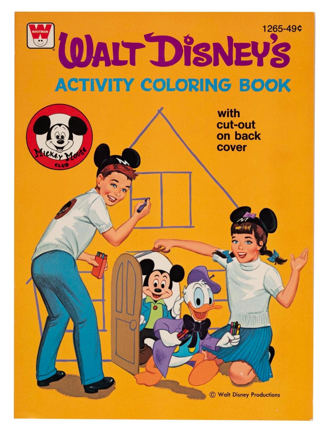(Whitman, 1974) A Walt Disney's Activity Coloring Book featuring the Mouseketeers and animated characters from "The Mickey Mouse Club." The back of the coloring book includes a cut-out Mousekewagon for holding crayons. Measuring 8" x 11", the book is in very good unused condition with one very small crease on the back cover spine.