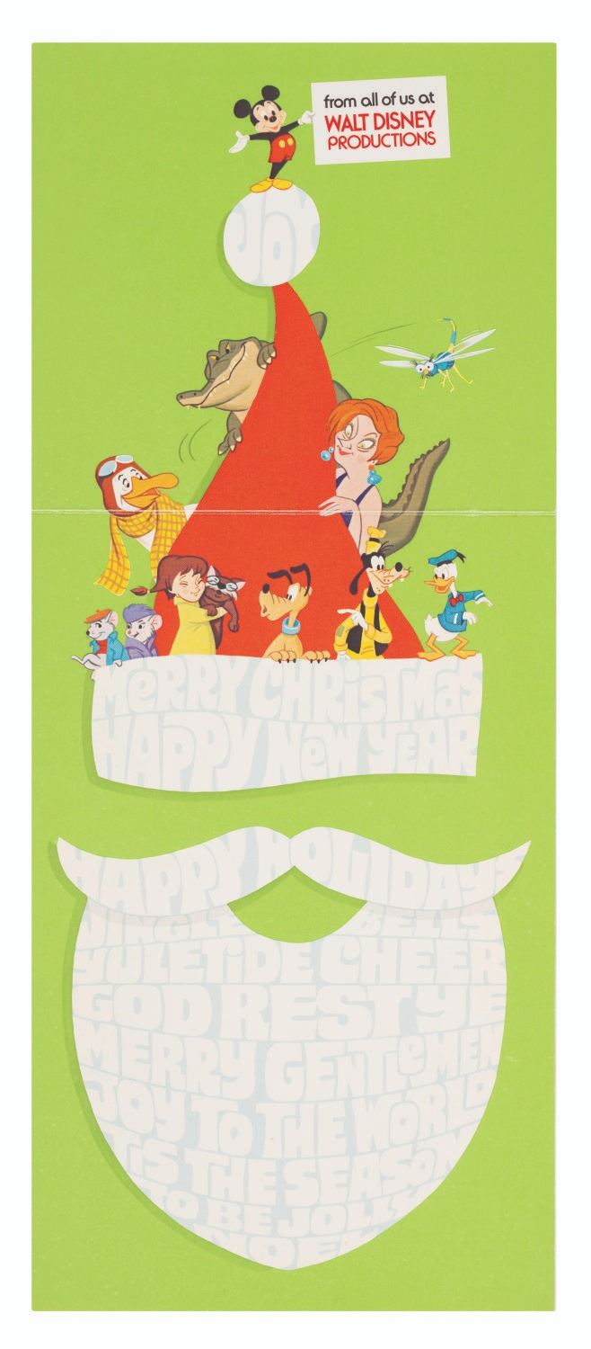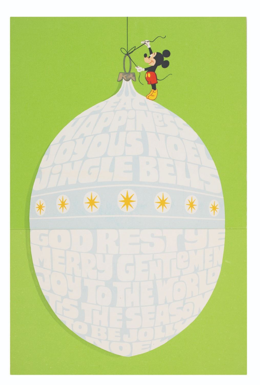 (Disney, 1976) A Walt Disney Productions corporate Christmas card. The card depicts Mickey Mouse standing atop a large ornament, and opens to reveal a calendar for 1977. Measuring 6"x9", the card is in fine condition with very minimal handling weasr.