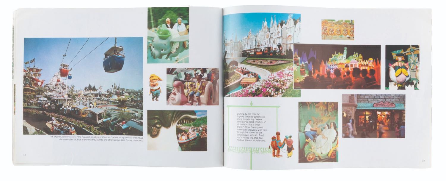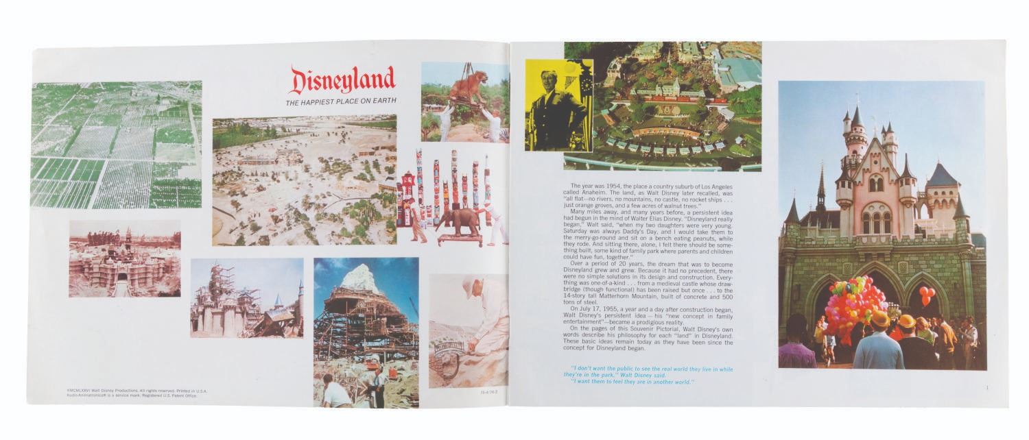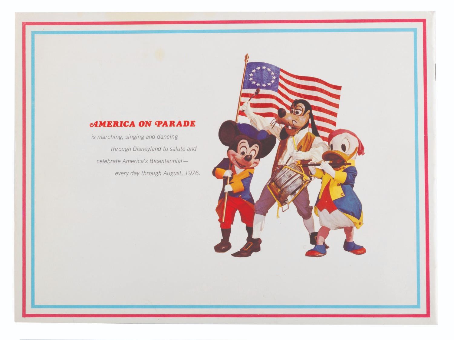 (Disneyland, 1976) A Walt Disney's Disneyland - A Pictorial Souvenir featuring colorful photographs of Disneyland, the Disneyland After Dark nighttime spectacular, Disneyland Hotel, and Anaheim Convention Center. The back cover advertises the Park's bicentennial celebration, "America on Parade." Measuring 8.75" x 11.75", the guide is in good condition with some creasing to the cover and surface wear along the spine.