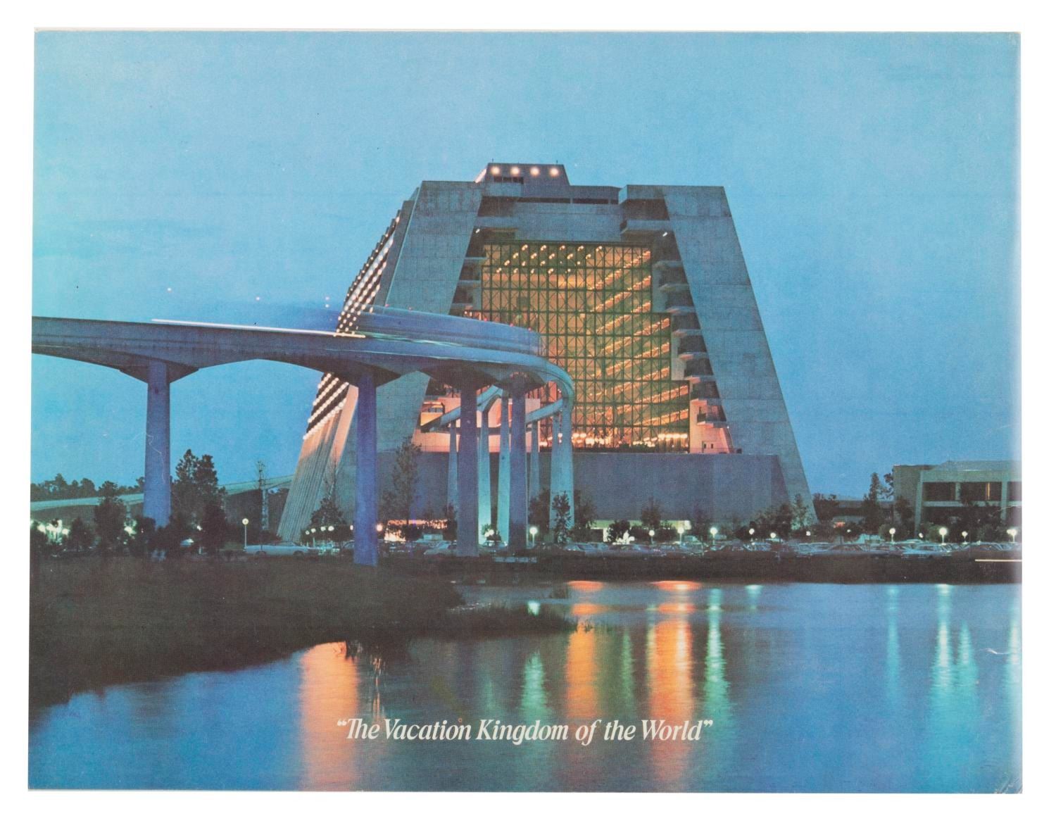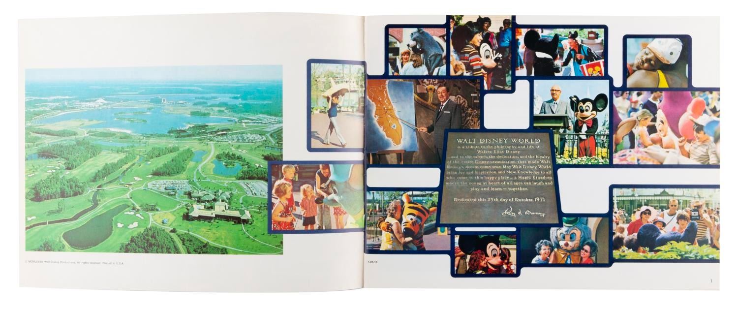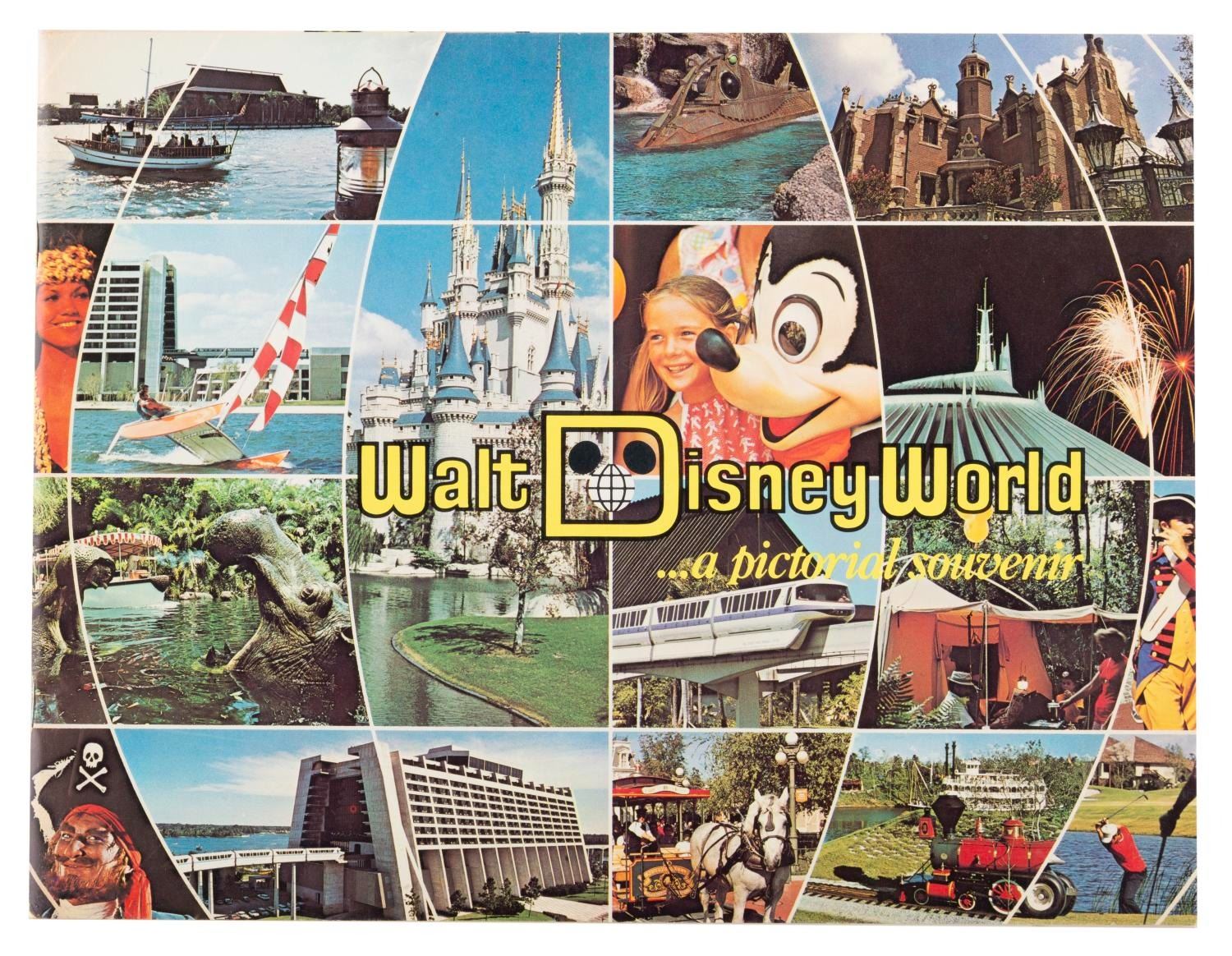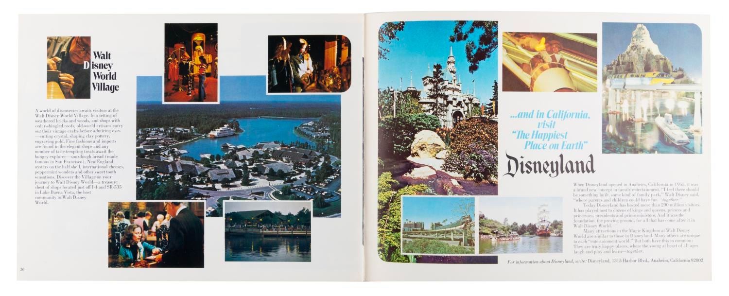 (Walt Disney World, 1977) A pictorial souvenir guidebook from Walt Disney World, with photos and information on the many Park lands and Resort Hotels offered in 1977. Measuring 8.75" x 11.5", the 36-page guide is in very good condition with light creases, wear, and discoloration from age.