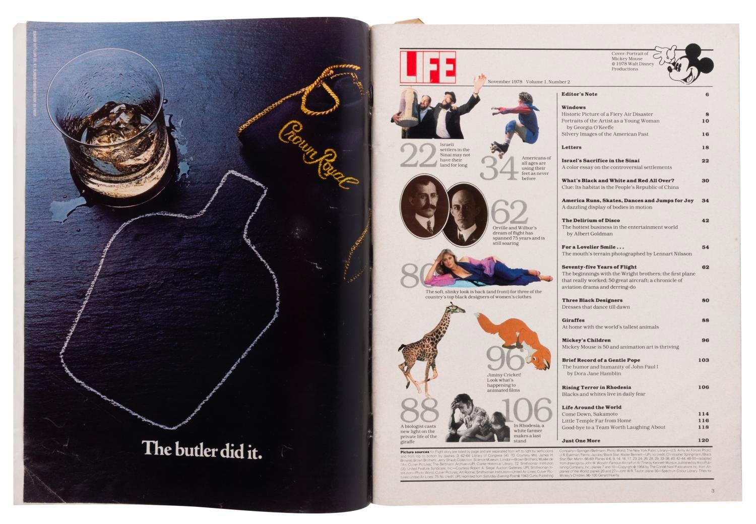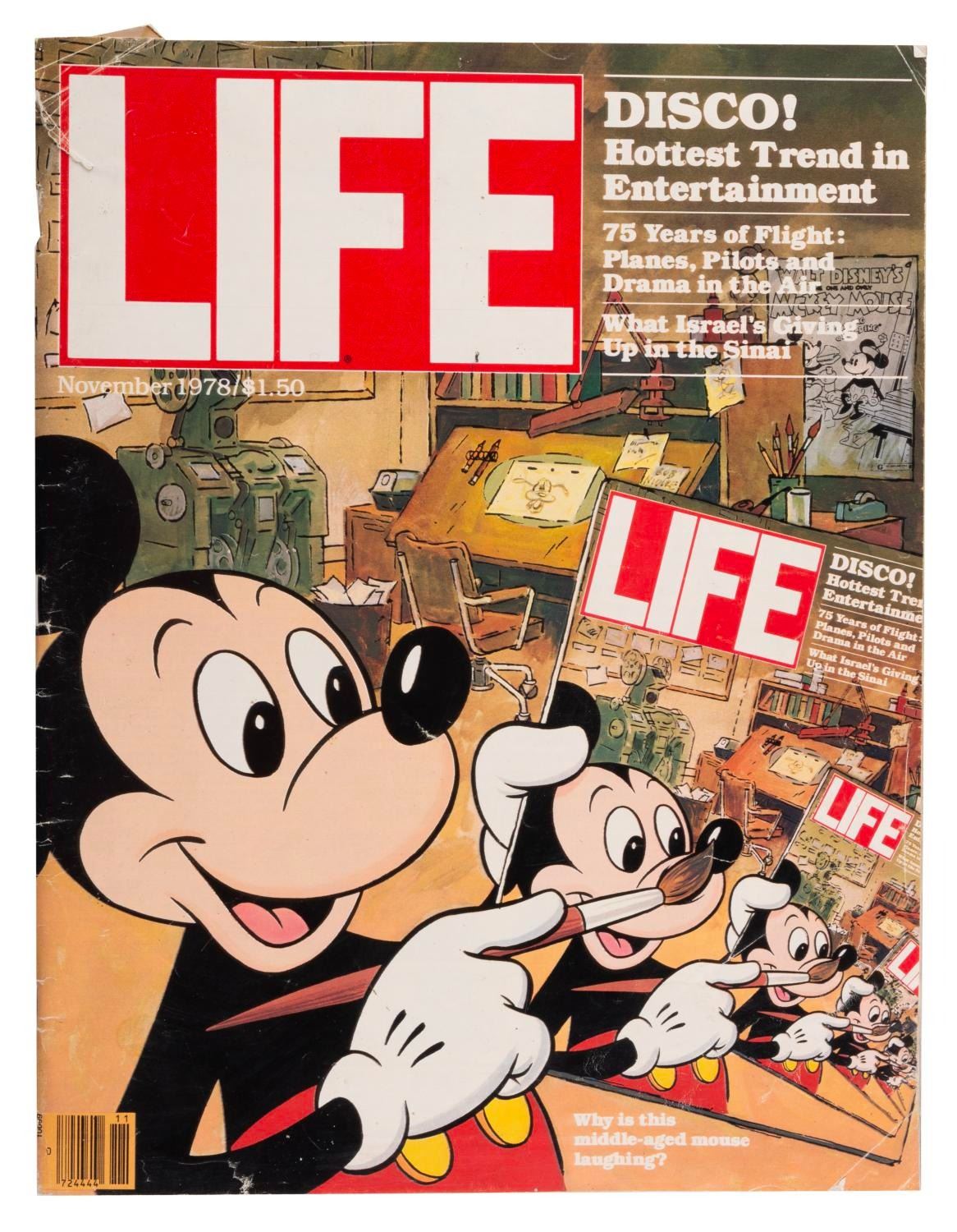 (LIFE, 1978) A November 1978 issue of LIFE magazine featuring a cover story on Mickey Mouse’s 50th birthday. Measuring 10" x 13" the magazine is in good condition with creasing, tears and stains.