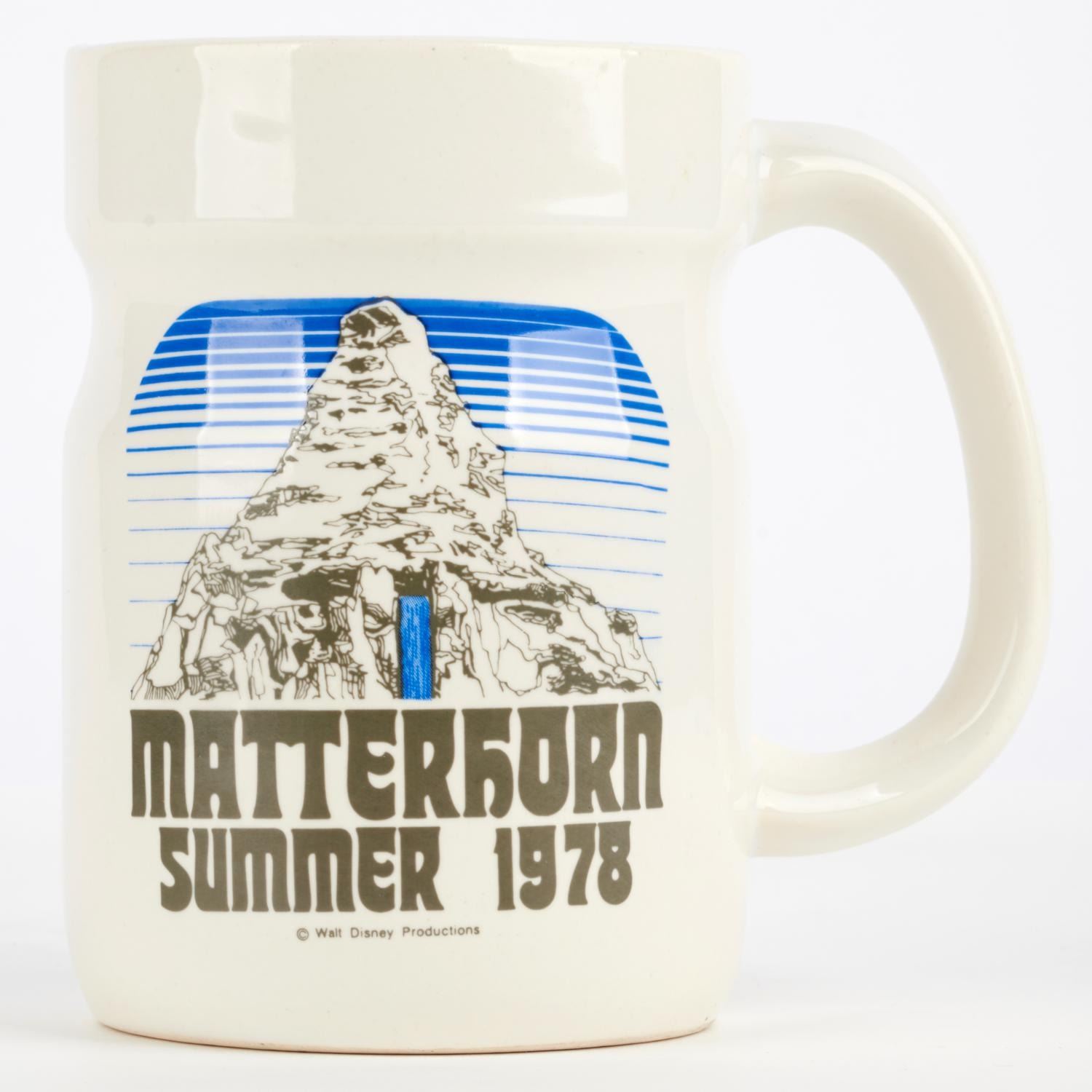 (Disneyland, 1978) A ceramic Cast Member mug reading "Matterhorn - Summer 1978," exclusively available to the opening crew after the massive refurbishment to the attraction that included introducing abominable snowmen. Measuring 5.25" x 3.25" and 5" tall, the mug is in very good condition with spots of discoloration from age.