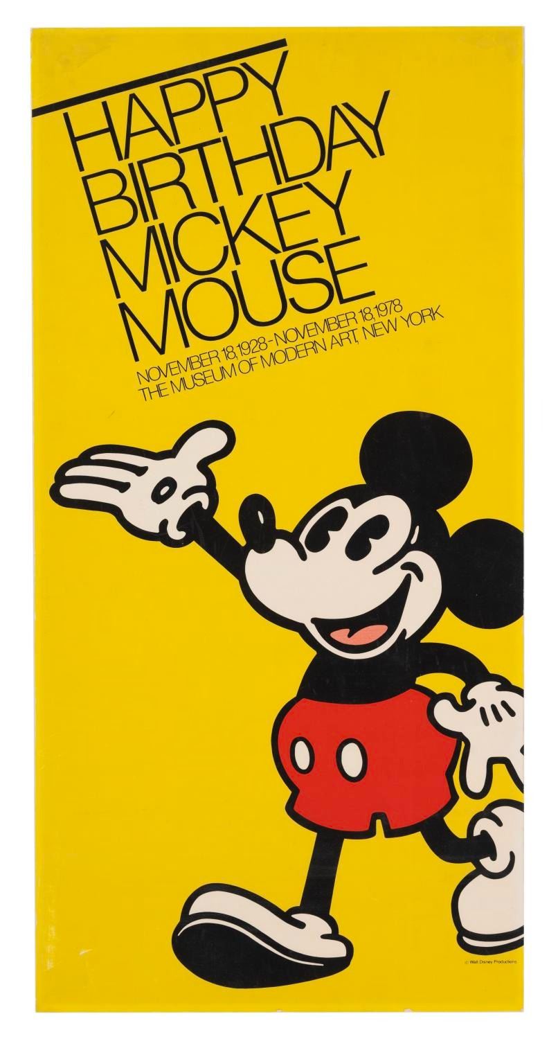 (MOMA, 1978) A poster from the New York Museum of Modern Art Exhibit “Happy Birthday Mickey Mouse” which celebrated Mickey’s 50th birthday on November 18, 1978. Measuring 17” x 34”, the poster on heavy cardstock is in very good condition with small scuffs, and edge wear including creases at the top corners.