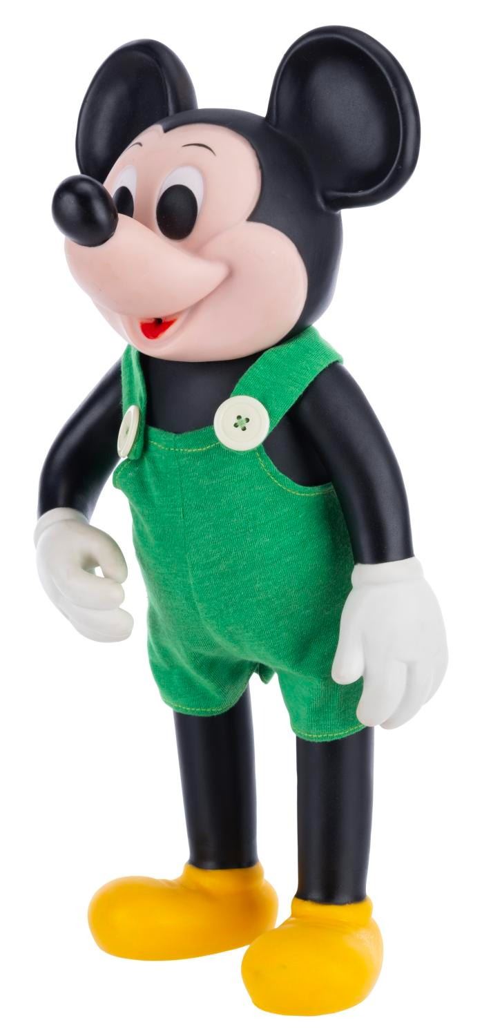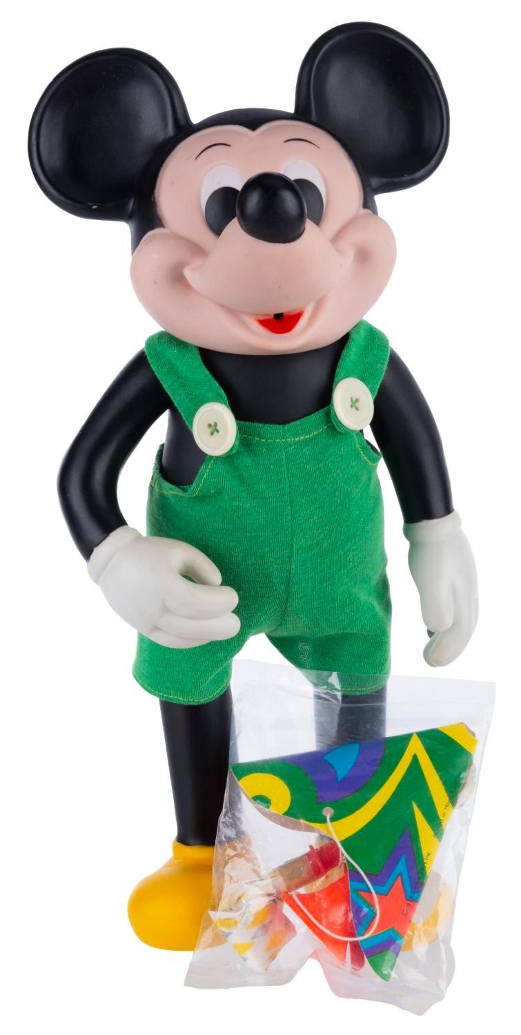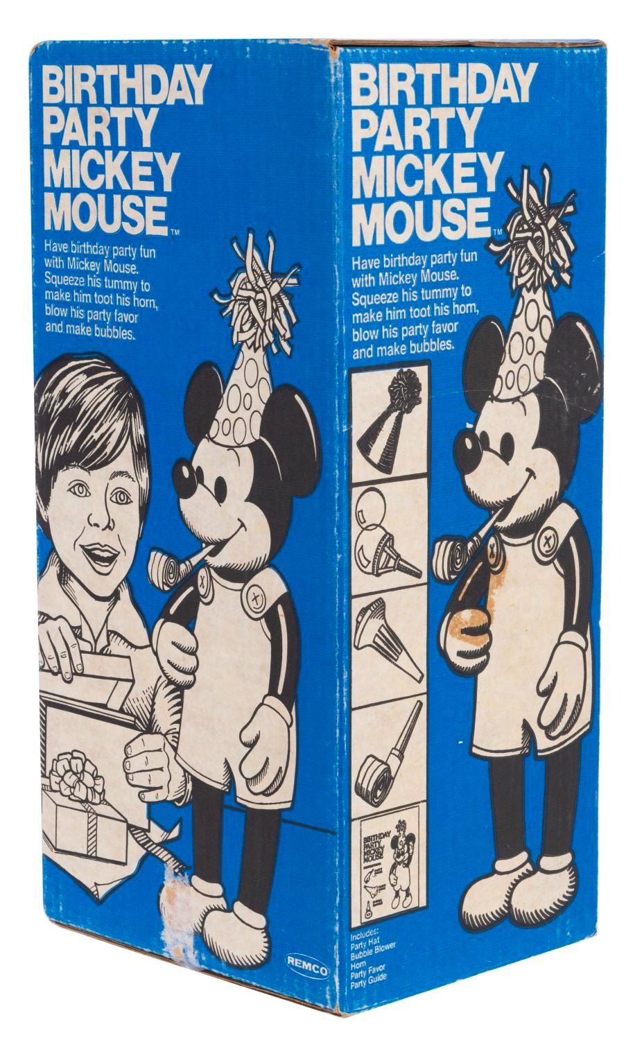 (Remco, 1978) An interactive Mickey Mouse doll commemorating the beloved character's 50th birthday. Included are a party hat, a party favor, a guide, a bubble blower, and a horn. The original box measures 7.5" x 6.5" x 15.5" tall and the doll measures 14" in length. The items are in good condition with wear from use, including light paint loss and scuffing, and tackiness on the vinyl of the right arm due to age. The party favors are unopened and untested, and both the box and instructions have wear from use and age.