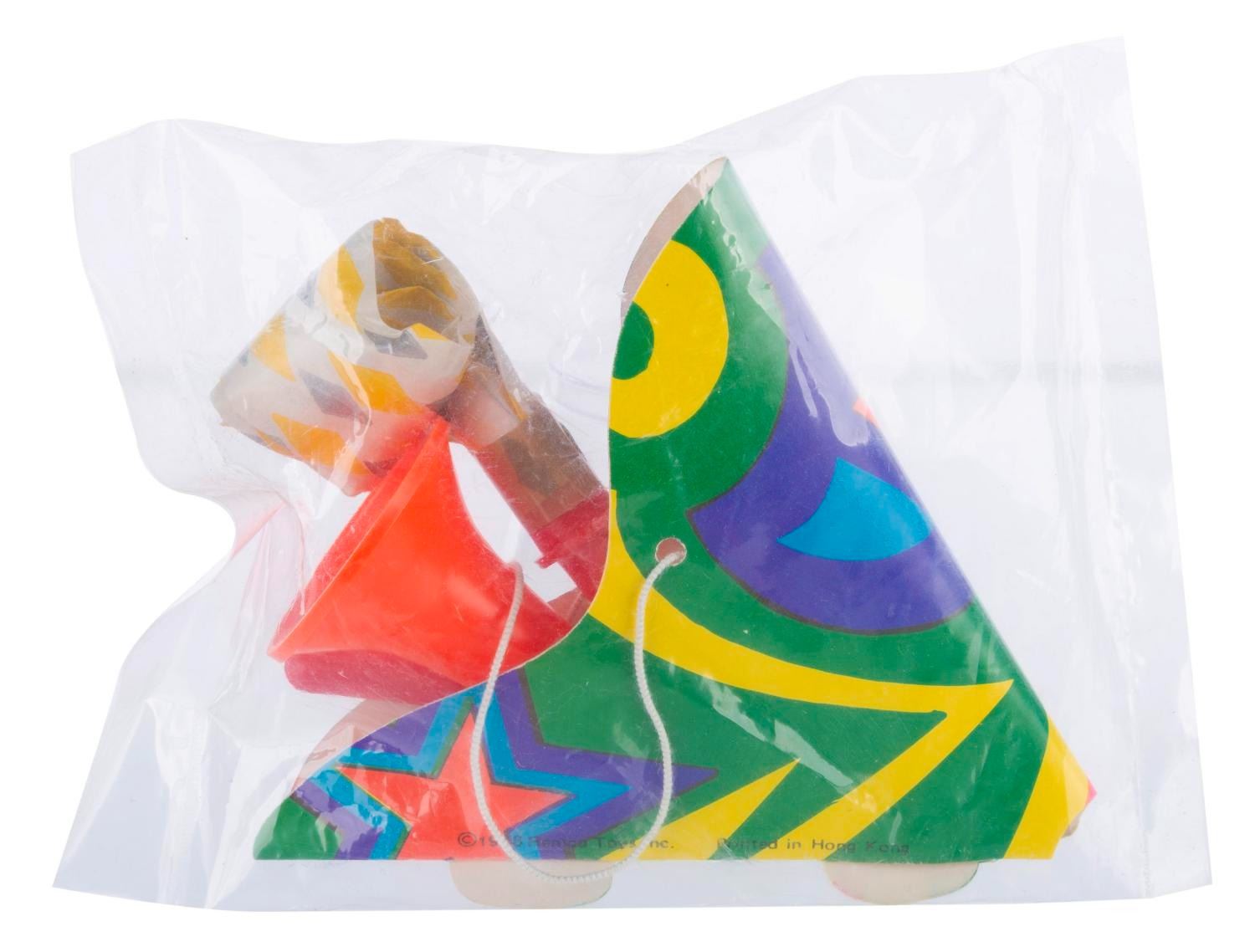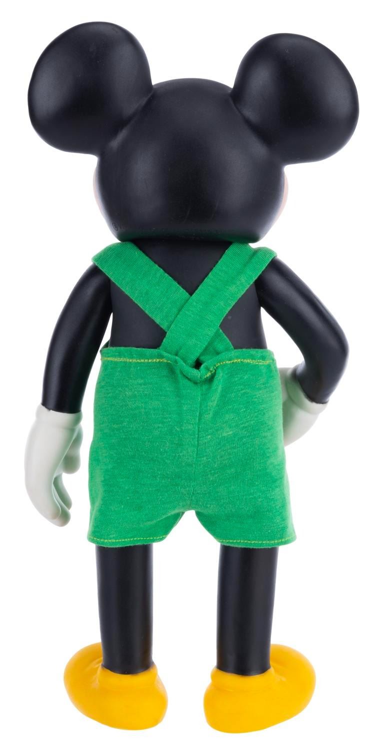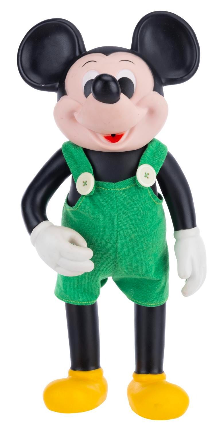 (Remco, 1978) An interactive Mickey Mouse doll commemorating the beloved character's 50th birthday. Included are a party hat, a party favor, a guide, a bubble blower, and a horn. The original box measures 7.5" x 6.5" x 15.5" tall and the doll measures 14" in length. The items are in good condition with wear from use, including light paint loss and scuffing, and tackiness on the vinyl of the right arm due to age. The party favors are unopened and untested, and both the box and instructions have wear from use and age.