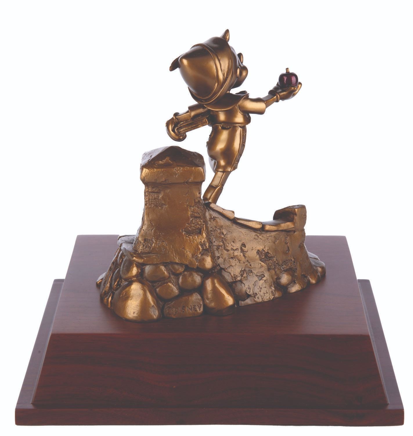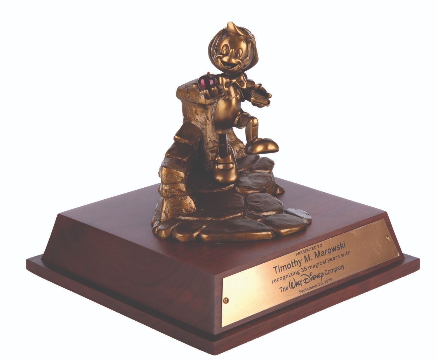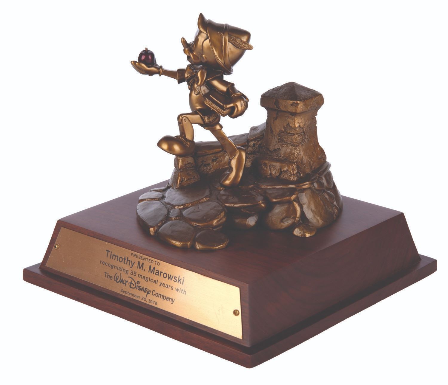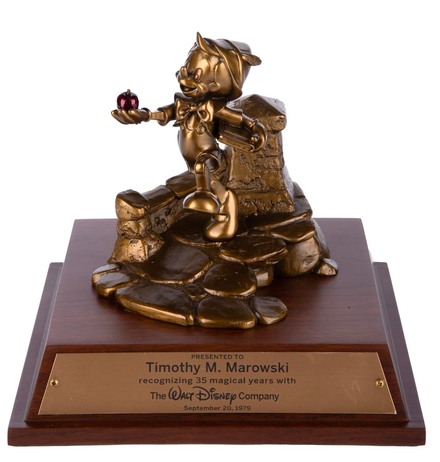 (Disney, 1979) A rare 35-year service award, presented to Timothy Marowski. The award features a cast-metal Pinocchio on a wooden base and a custom engraved plaque. This item measures 8.5" x 8.5" x 7.5" tall and is in fine condition.